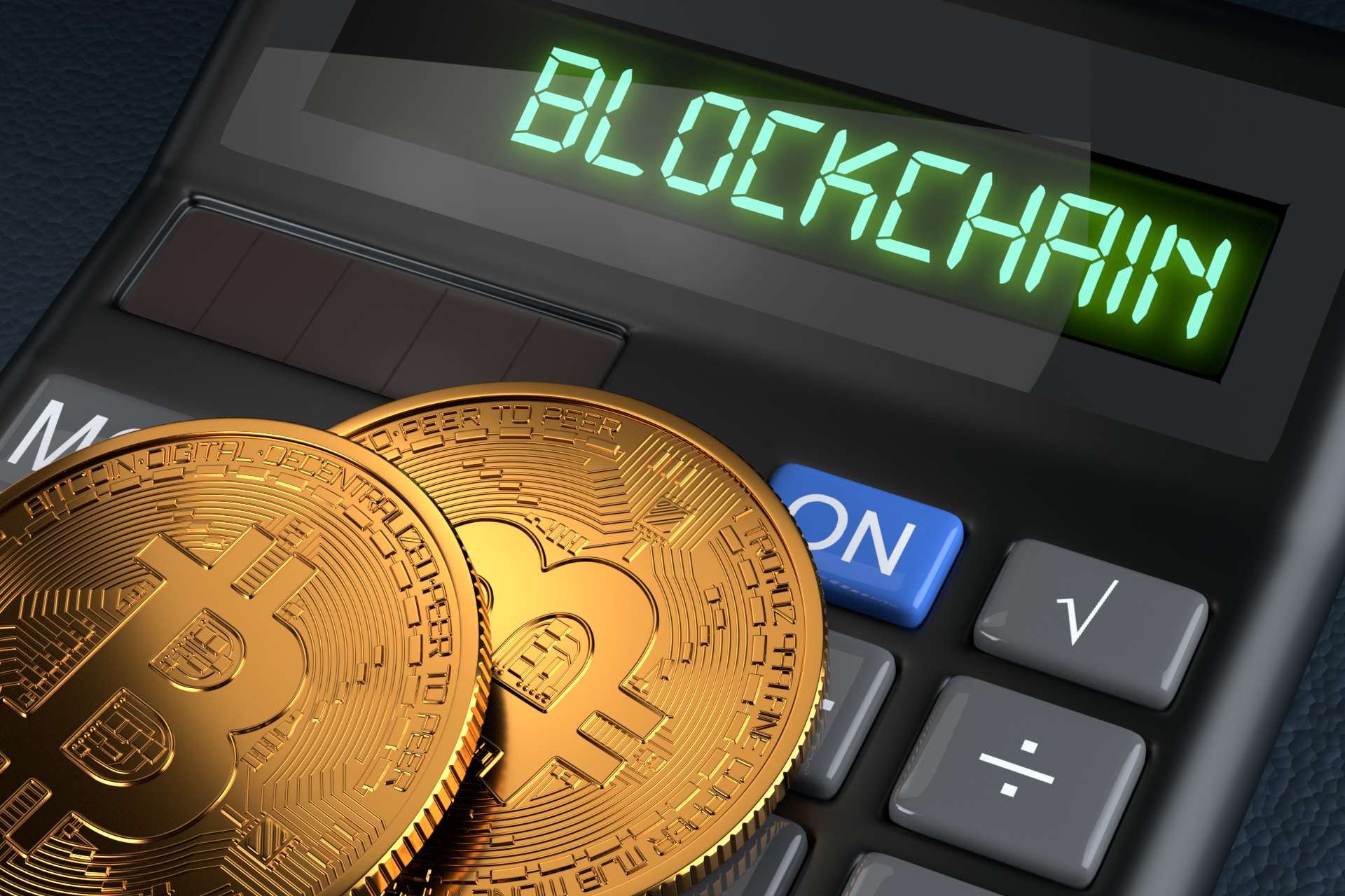 Two Bitcoins laid on a calculator with LCD displaying the word blockchain