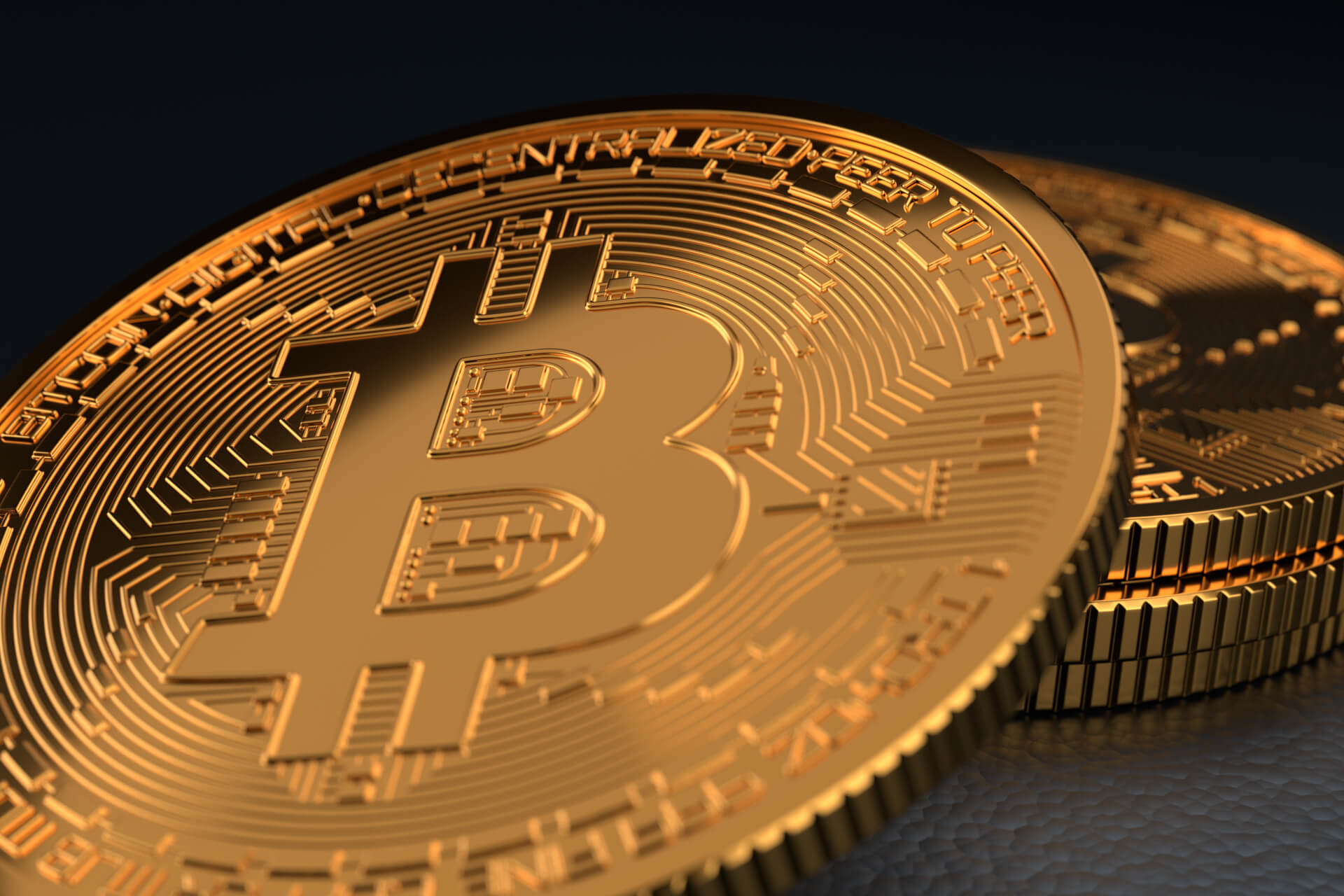 Close-up photo of Bitcoin leaning against small stack of Bitcoins