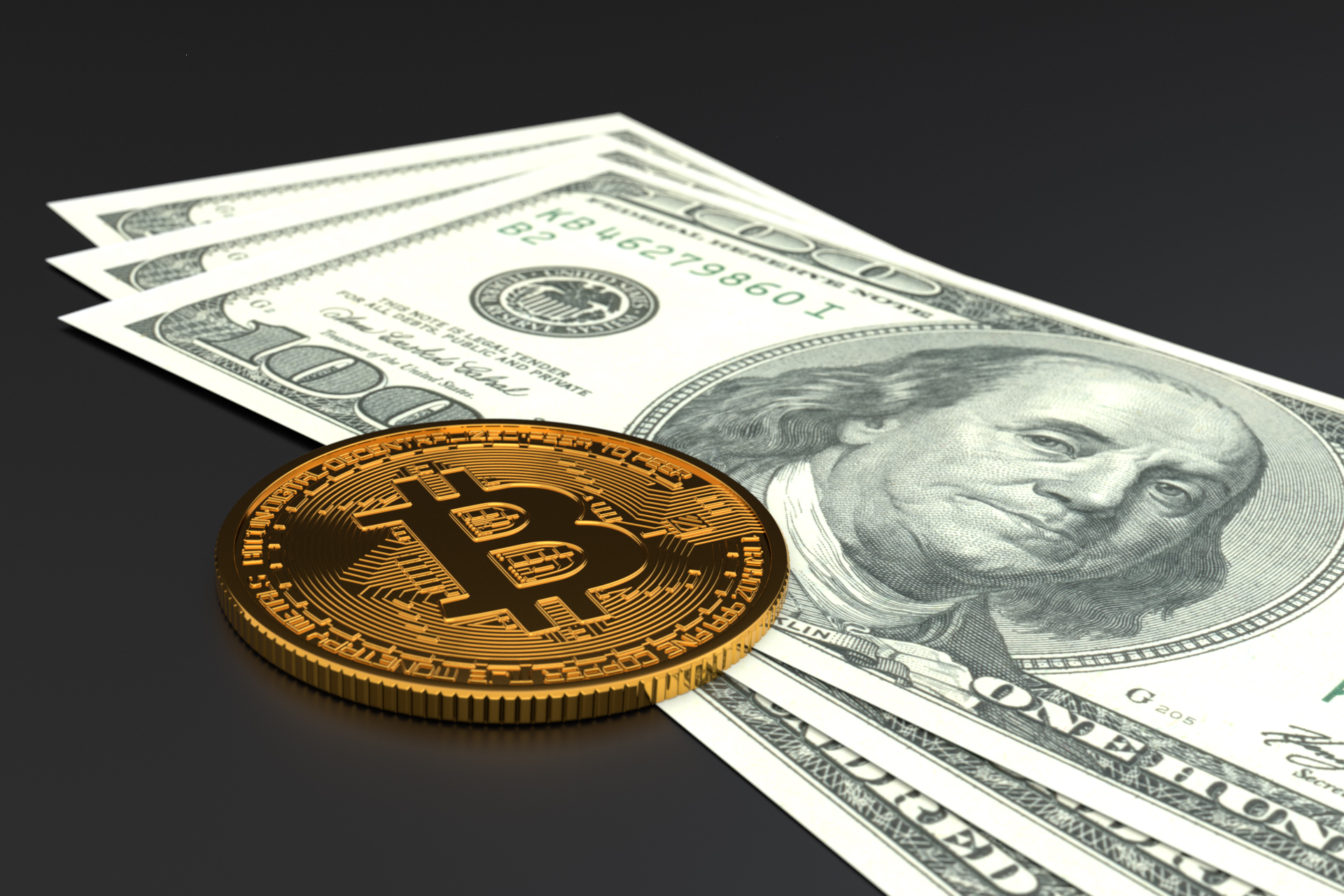 Single Bitcoin laying on top of three U.S. one hundred dollar bills