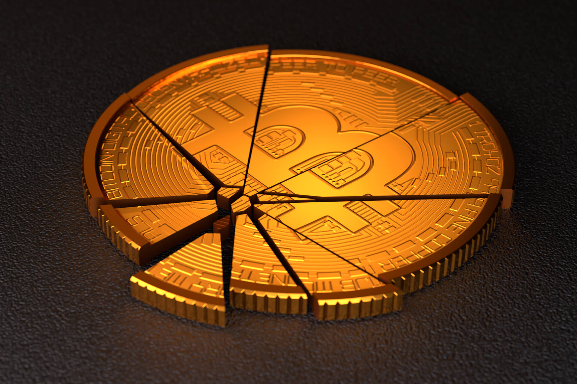 Broken Bitcoin with spot lighting representing cryptocurrency market crash or steep price decline