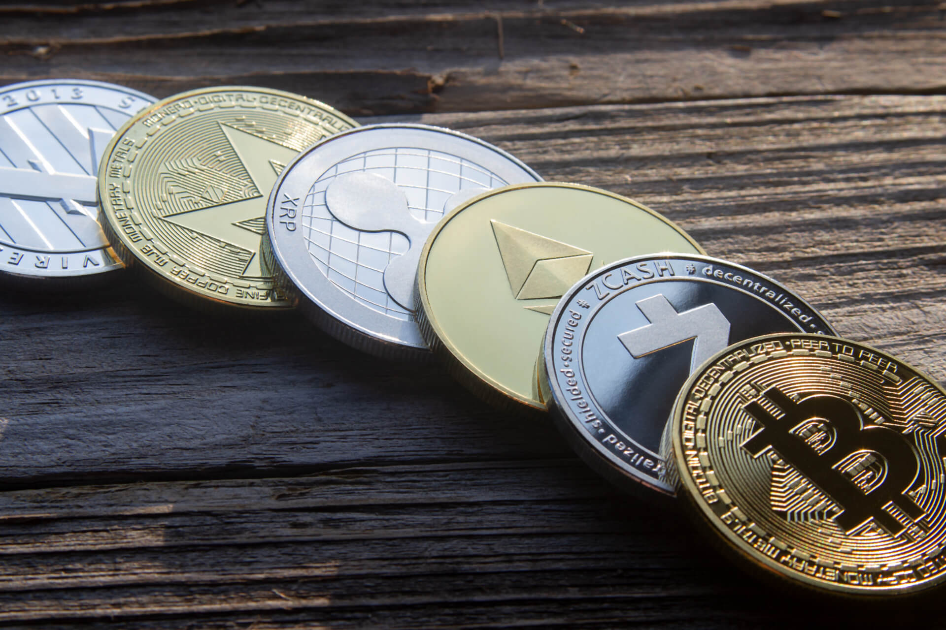Bitcoin, Zcash, Ethereum, Ripple, Monero, and Litecoins in a curved row