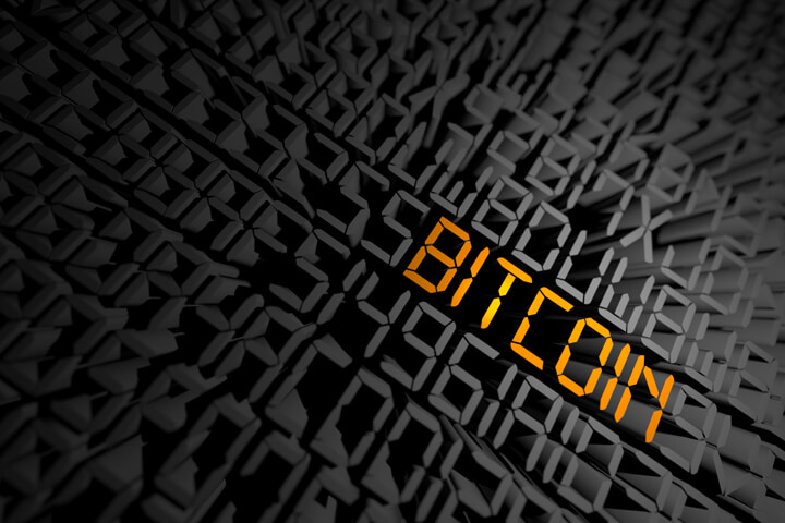 Gold digital Bitcoin text in string of encrypted digital characters different camera angle