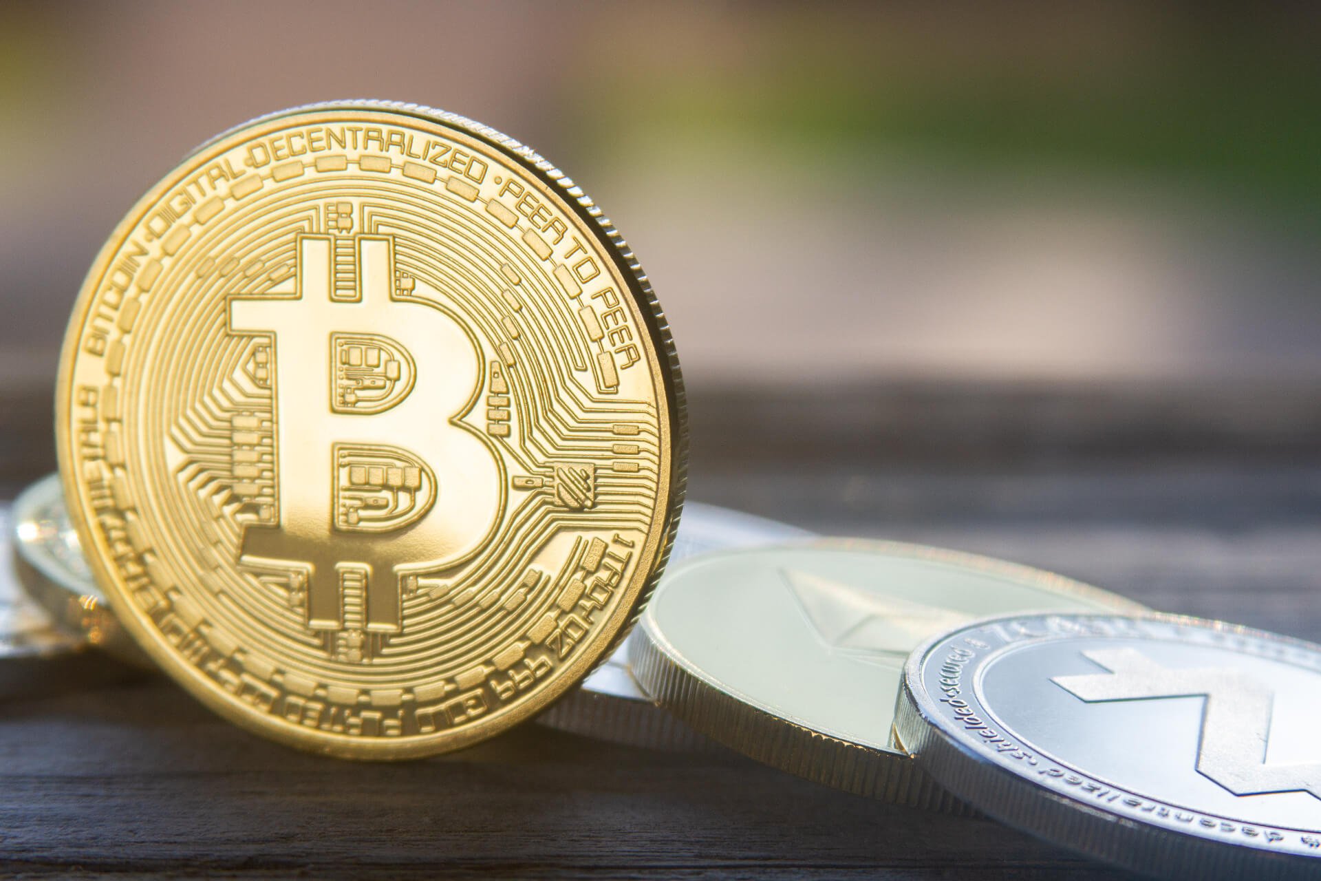 Bitcoin on edge in front of row including Zcash, Ethereum, Ripple, Monero, and Litecoin