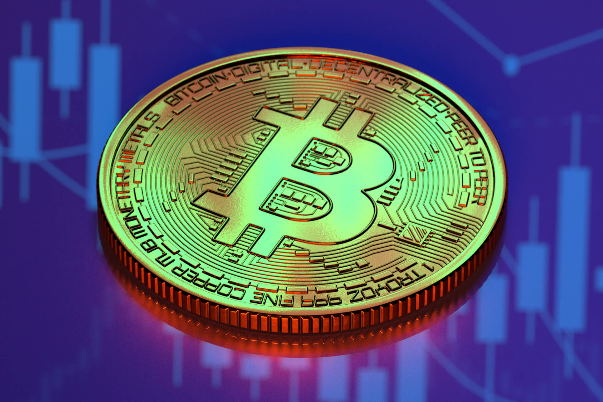 Bitcoin on reflective surface reflecting candlestick chart from monitor