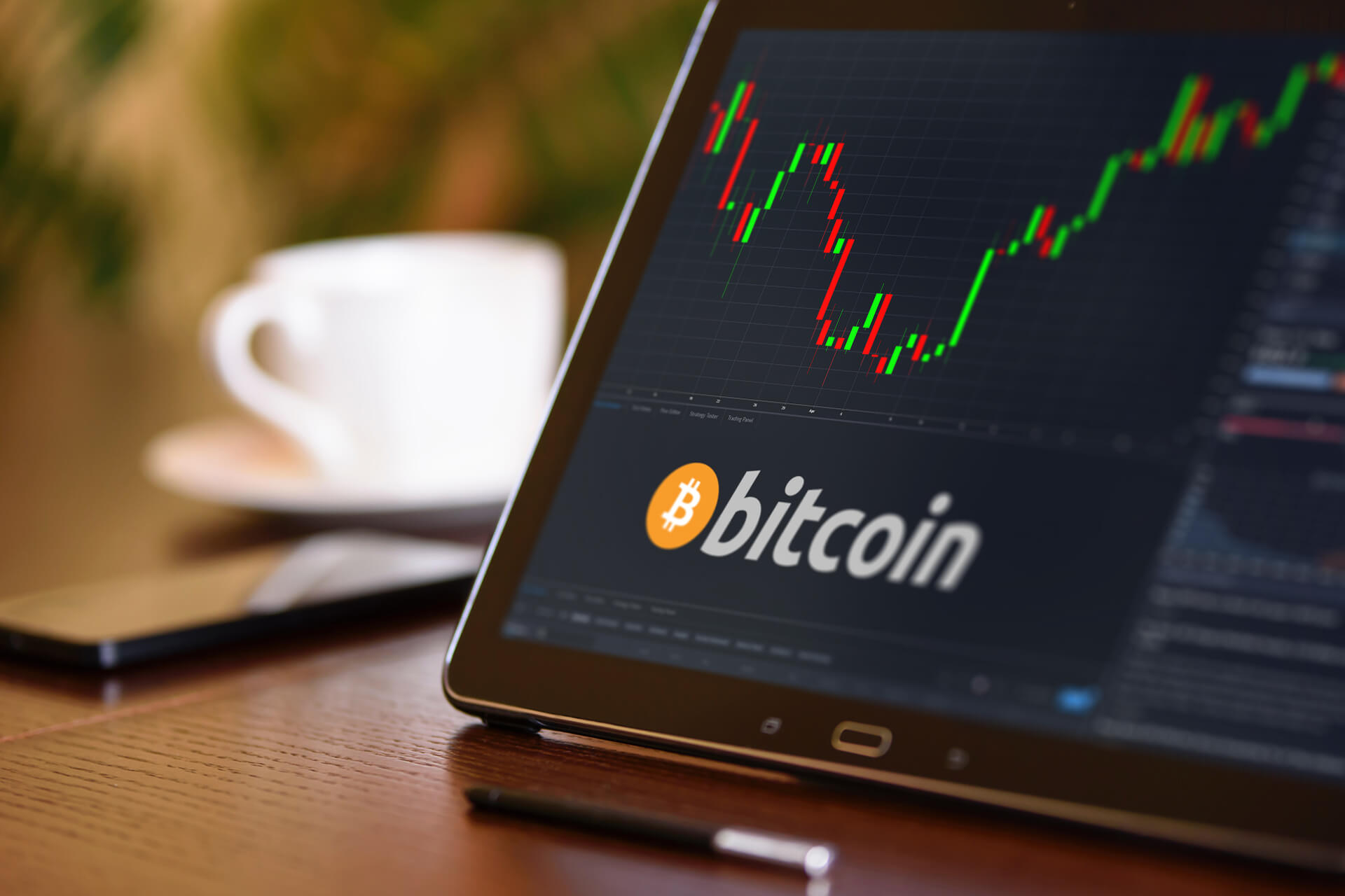 Tablet on desk with coffee cup and cell phone showing Bitcoin cryptocurrency logo and stock price candlestick chart