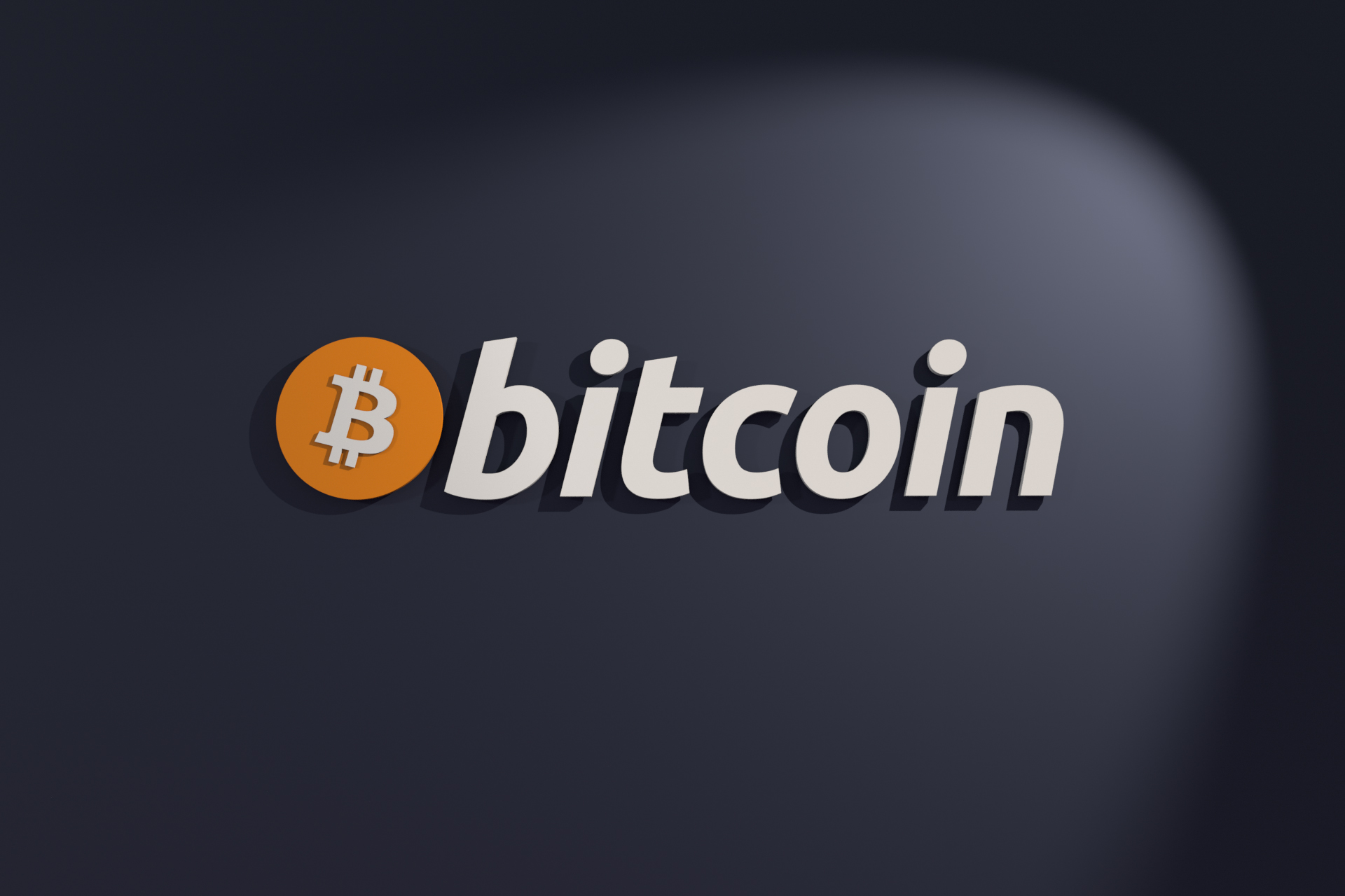 Bitcoin icon logo on dark wall with spotlight front view