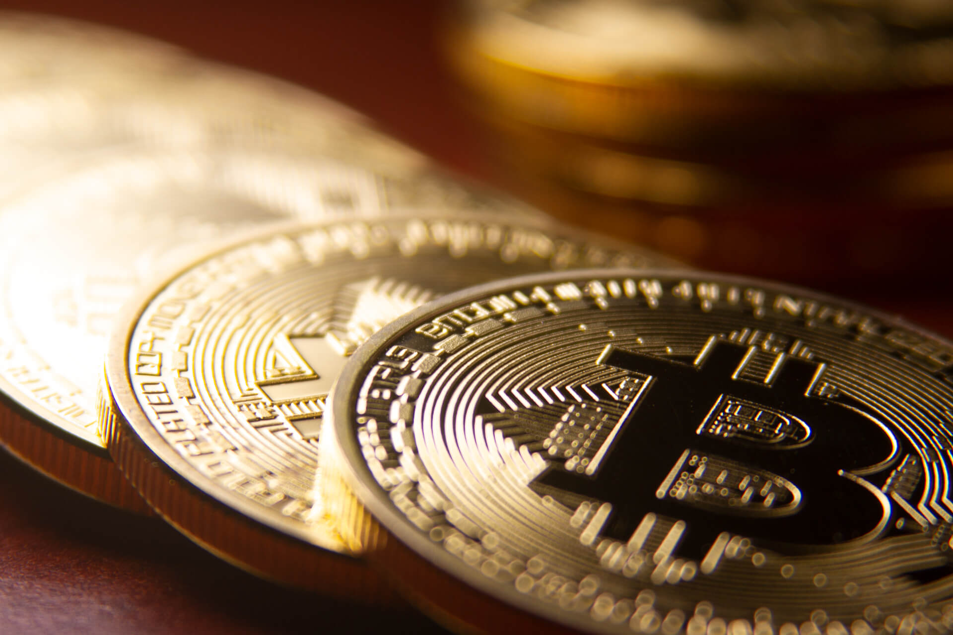Bitcoins arranged in a row with single coin in background with short depth of field