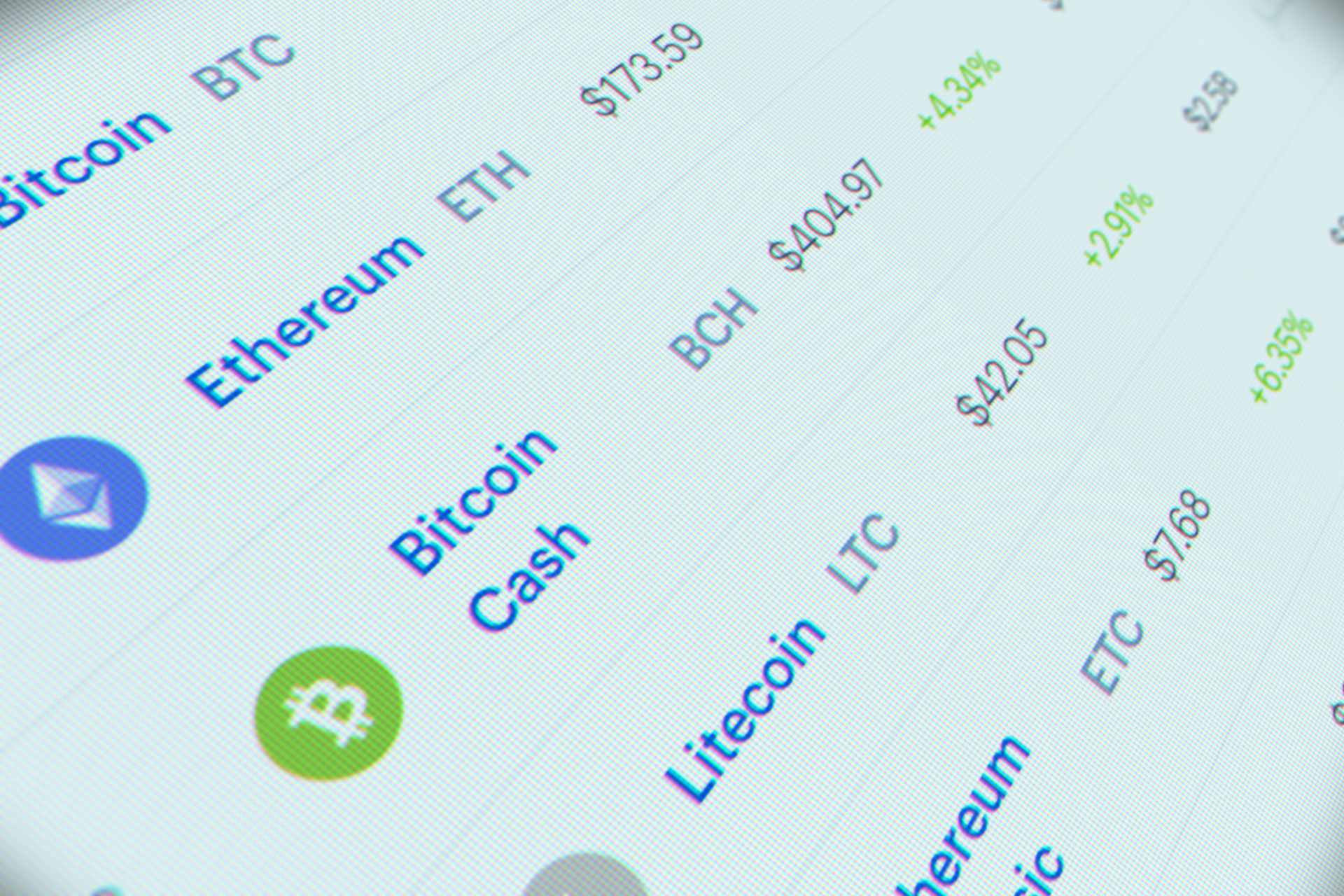 Computer monitor screenshot of cryptocurrency markets showing market capitalization and recent price change