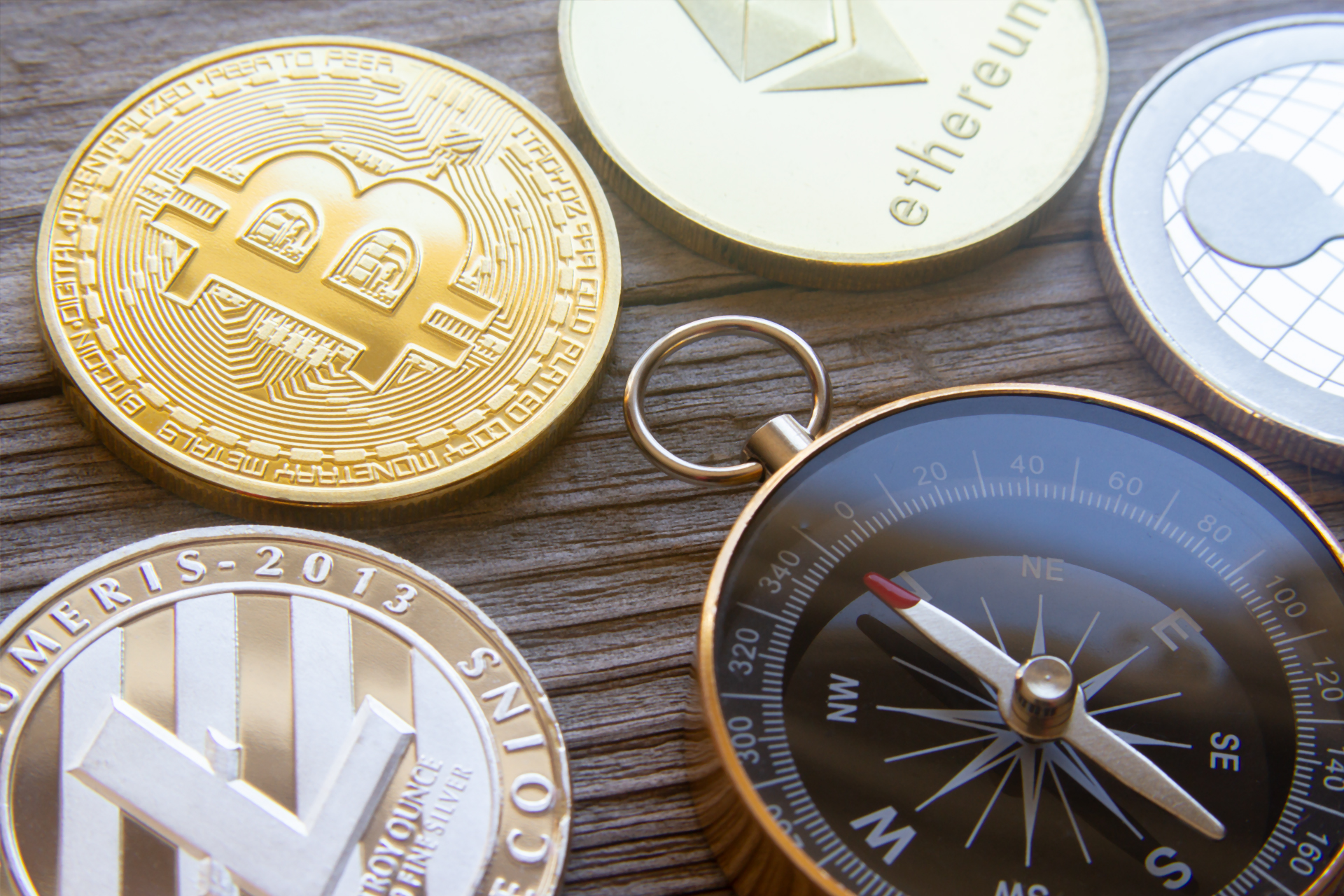Litecoin, Bitcoin, Ethereum, and Ripple coins with navigation compass pointing at Bitcoin
