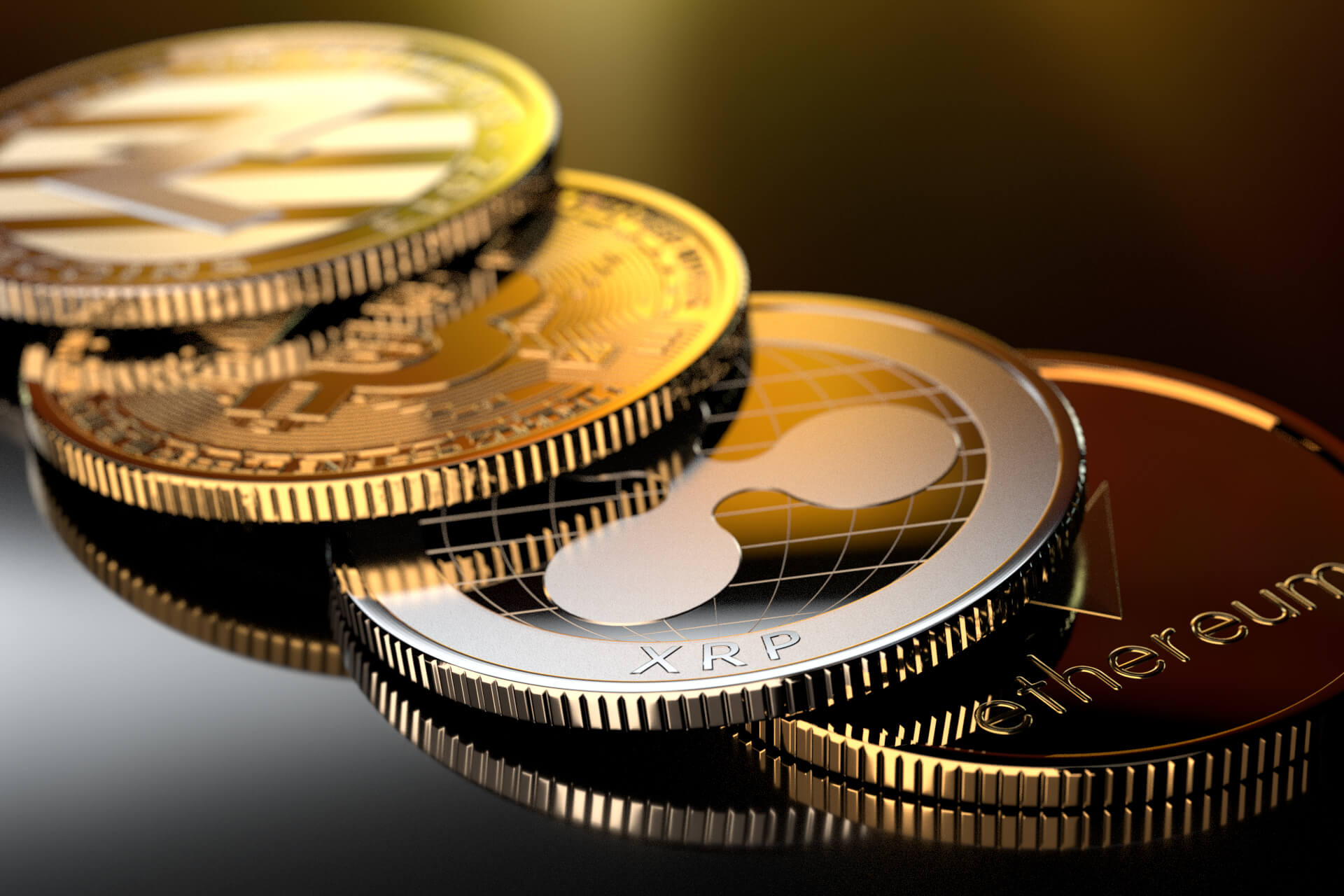 Ethereum, Bitcoin, Litecoin, and Ripple XRP coins with tarnish lying on assorted U.S. currency coins