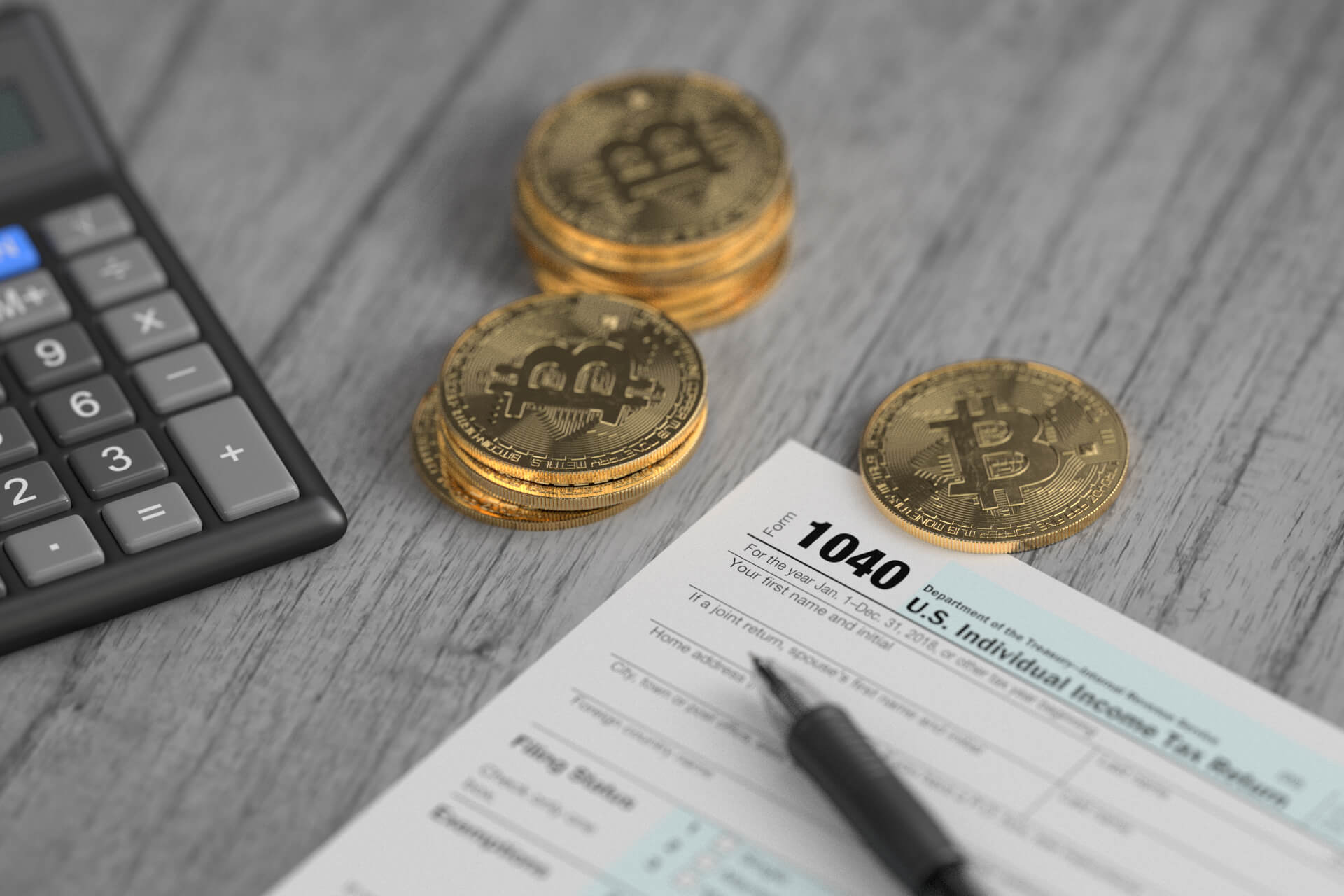 Stacks of Bitcoins surrounding IRS 1040 tax form with ballpoint pen and calculator concept for paying cryptocurrency taxes