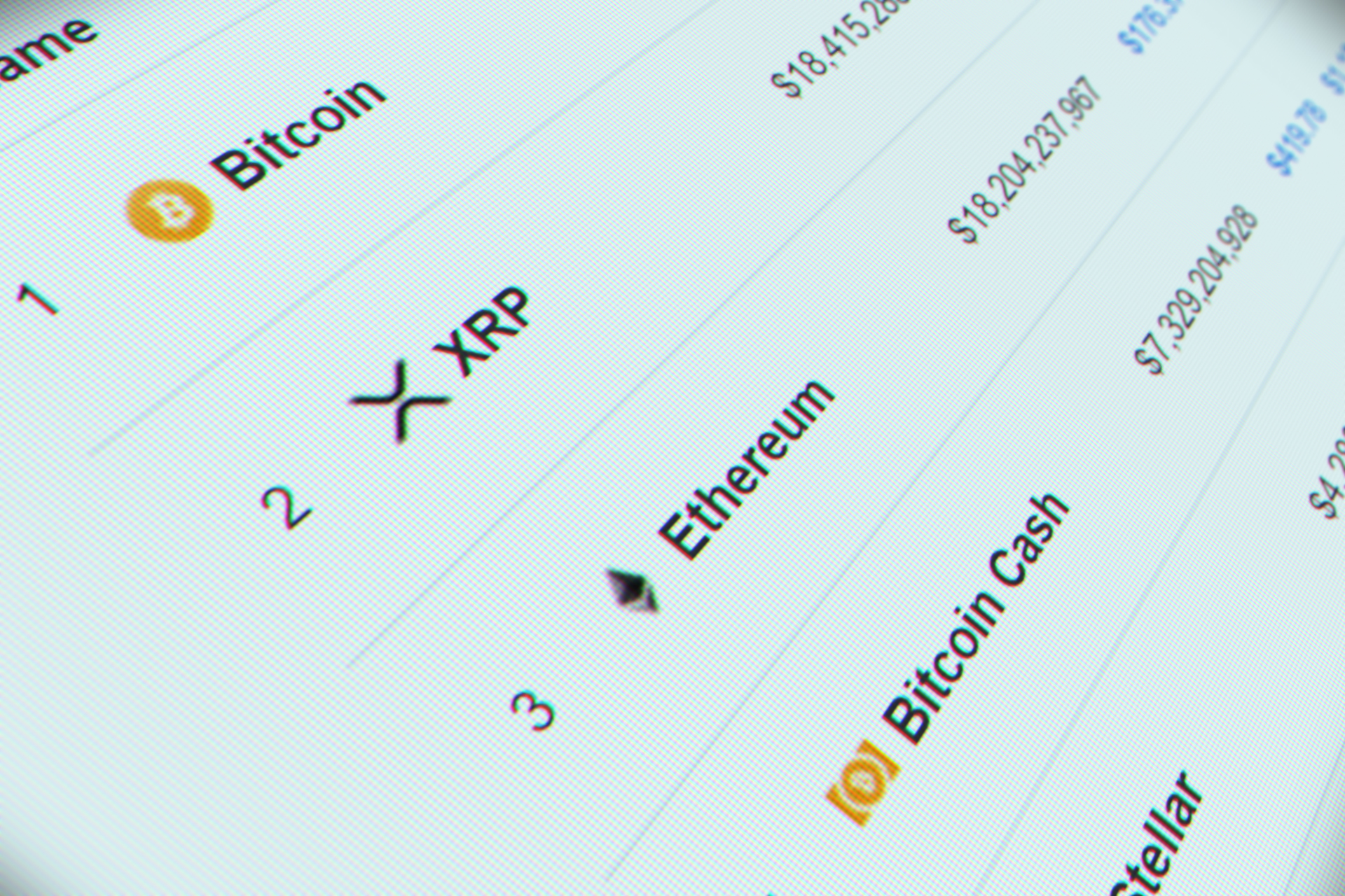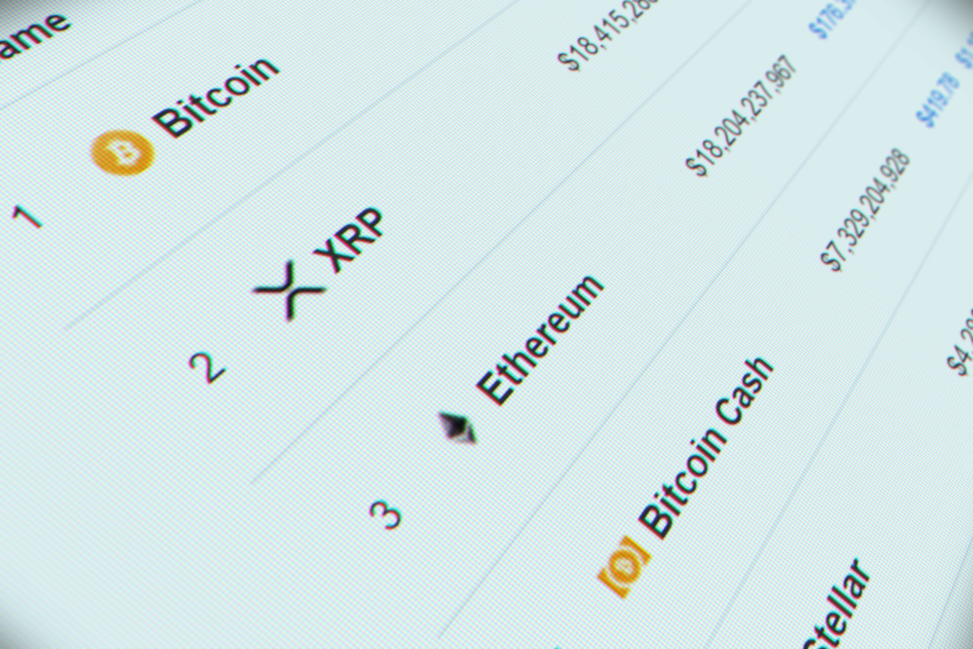 Computer monitor screenshot of cryptocurrencies showing Bitcoin, XRP, Ethereum, Bitcoin Cash, and Stellar logos with market cap values
