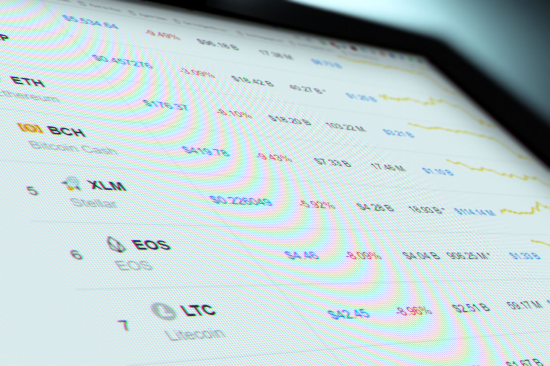 Computer monitor showing stock prices and market cap for Ethereum, Bitcoin Cash, Stellar, EOS, and Litecoin