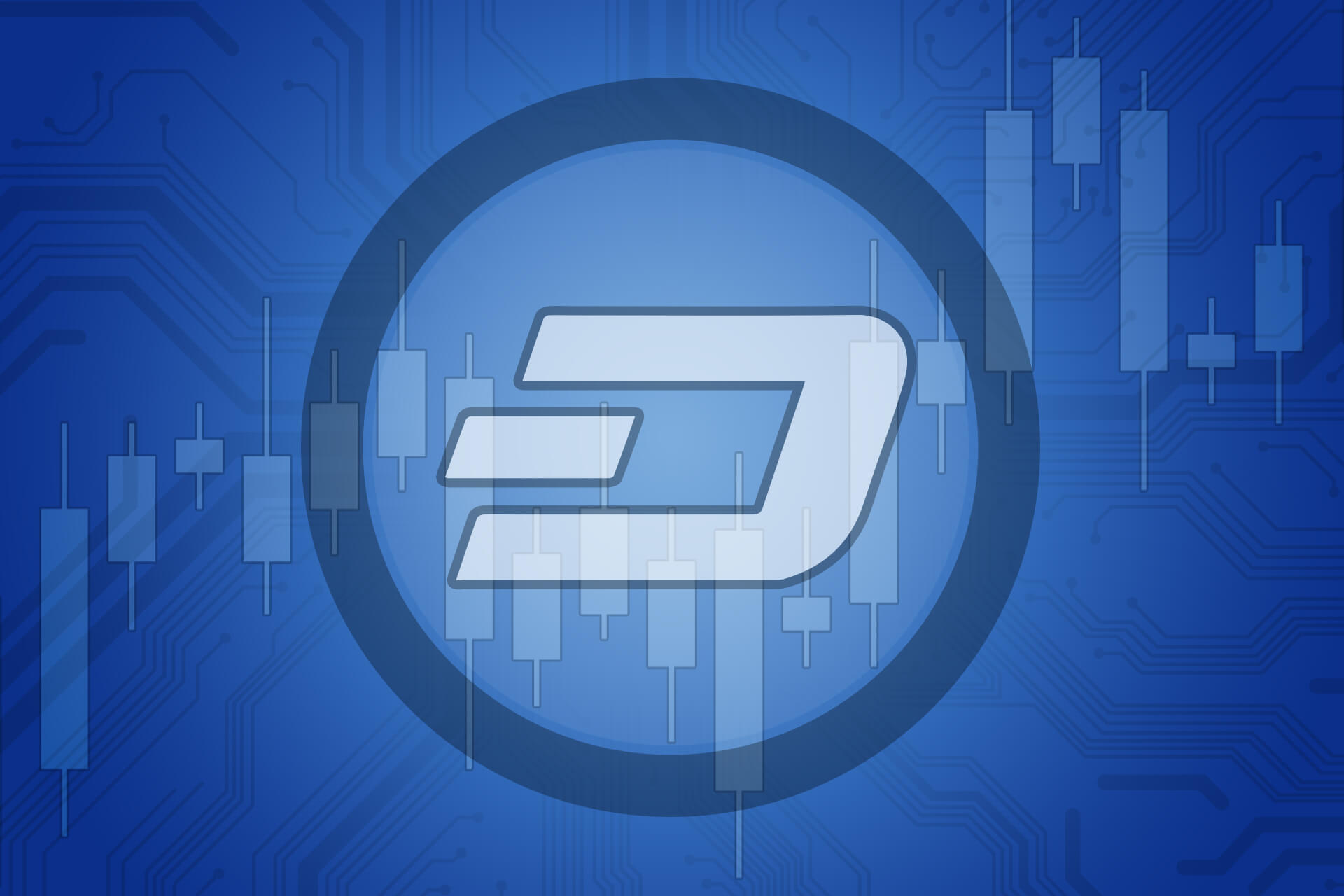 Dash cryptocurrency token overlaid on stock price candlestick chart and subtle circuit background