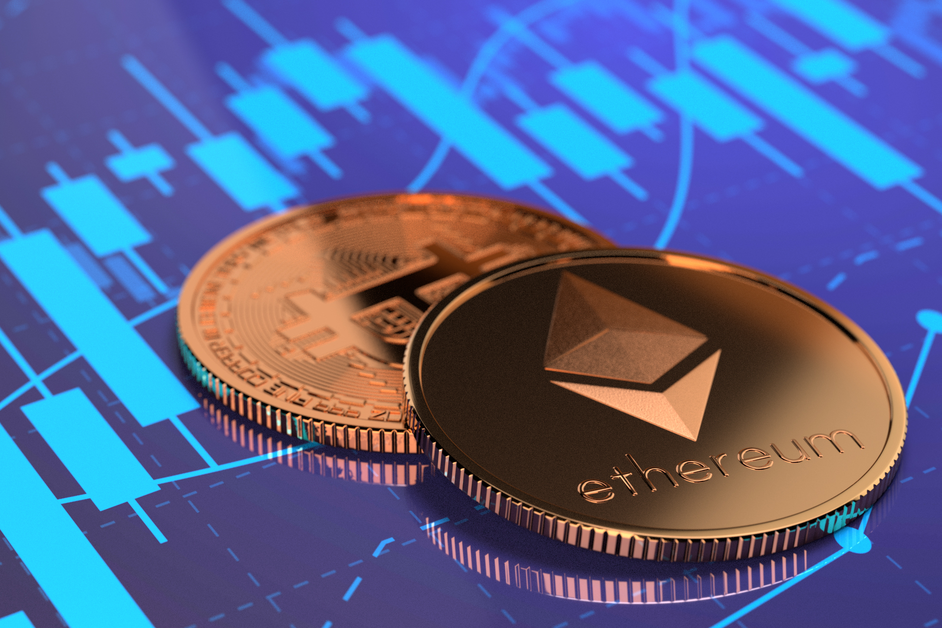Ethereum coin and Bitcoin on stock price candlestick chart