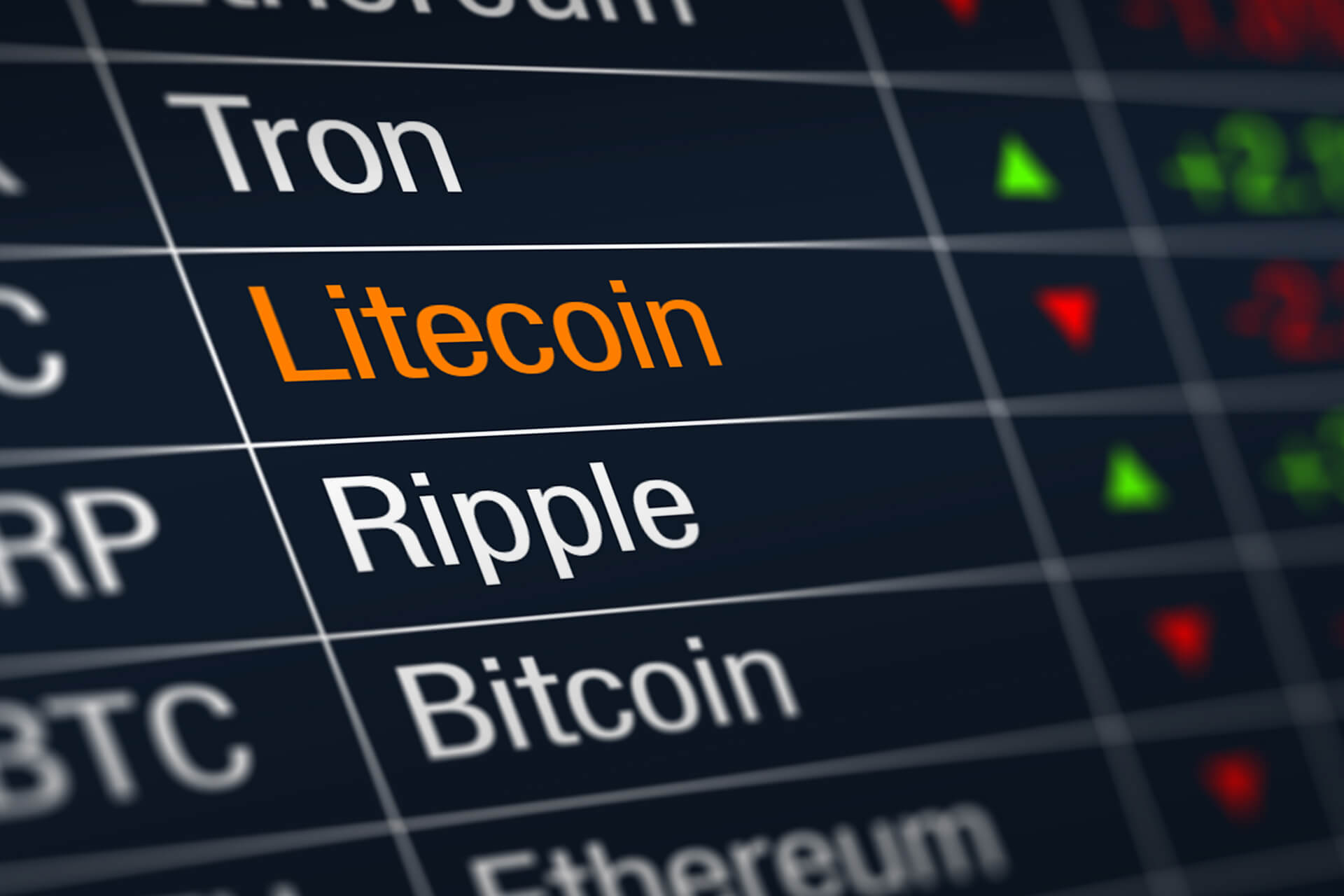 Stock ticker chart showing cryptocurrency prices with Litecoin price decrease highlighted