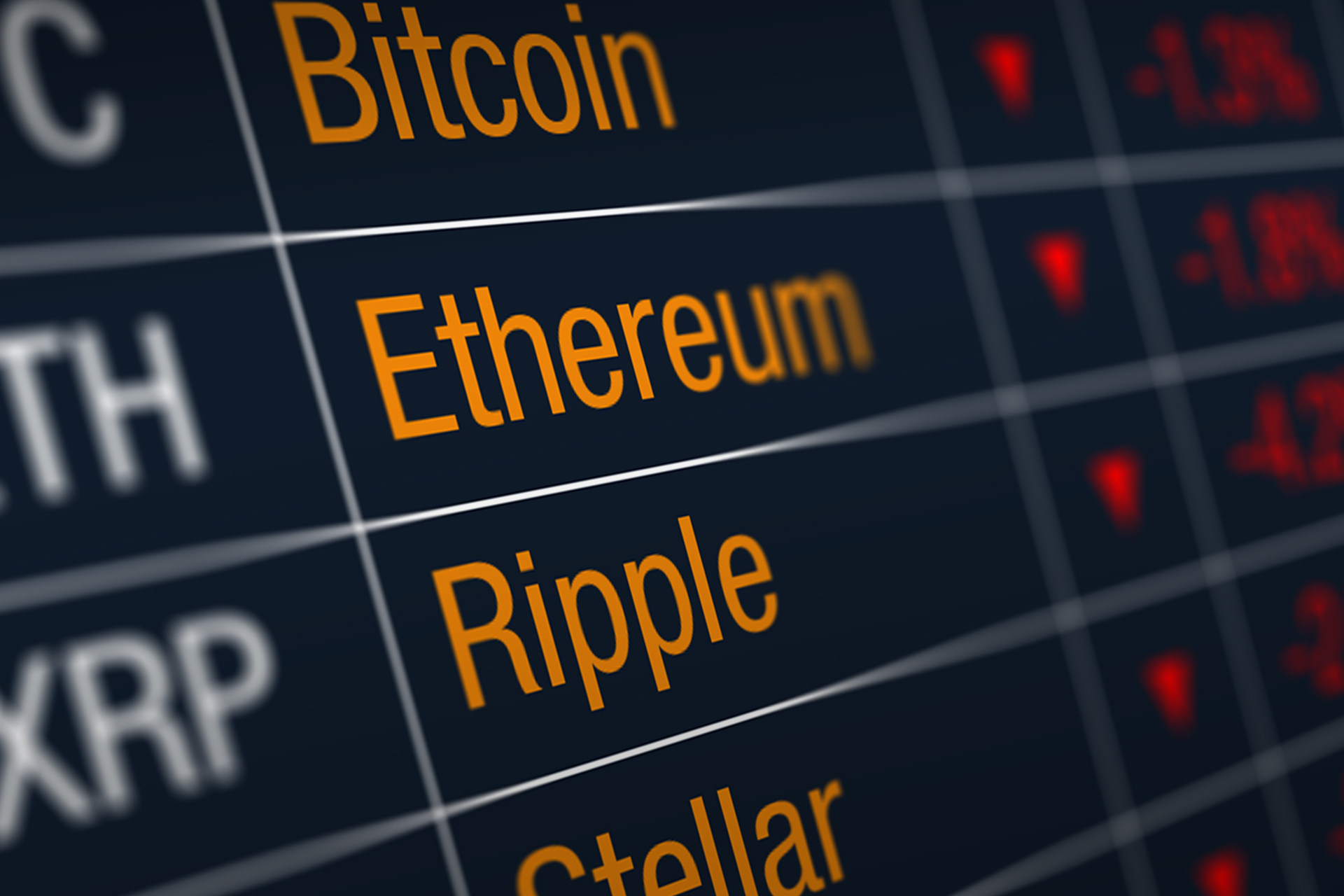 Stock ticker showing largest market capitalization cryptocurrencies all with trading session price declines