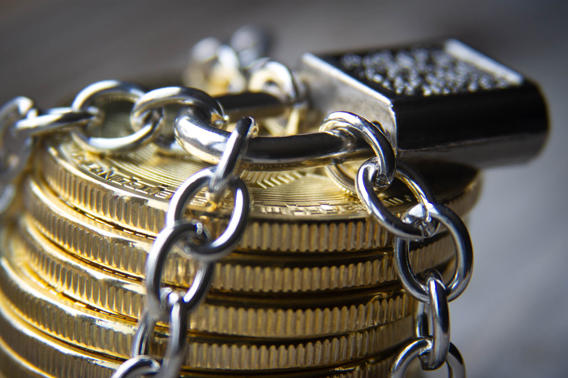 Stack of Bitcoins wrapped with chains and locked with a padlock