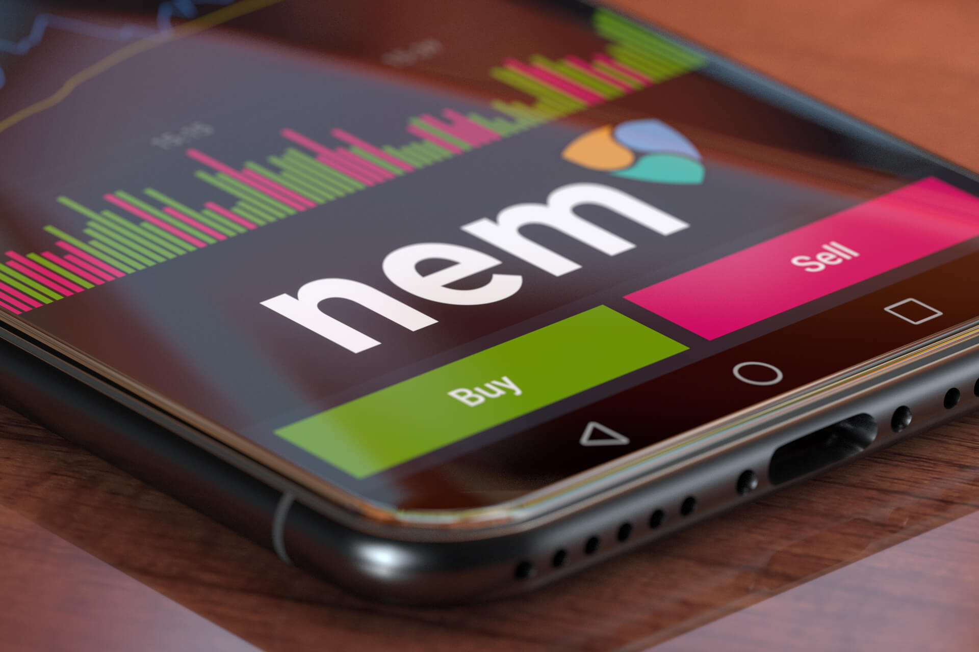 Nem exchange app on iPhone X screen showing Nem logo, trading volume, and option to buy or sell cryptocurrency