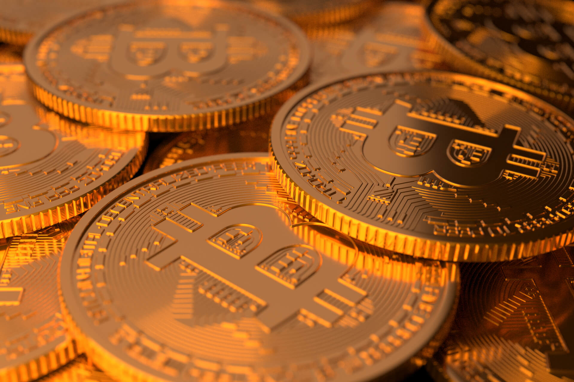 blockchain illuminated bitcoins crypto close-up cryptocurrency golden light soft random pile