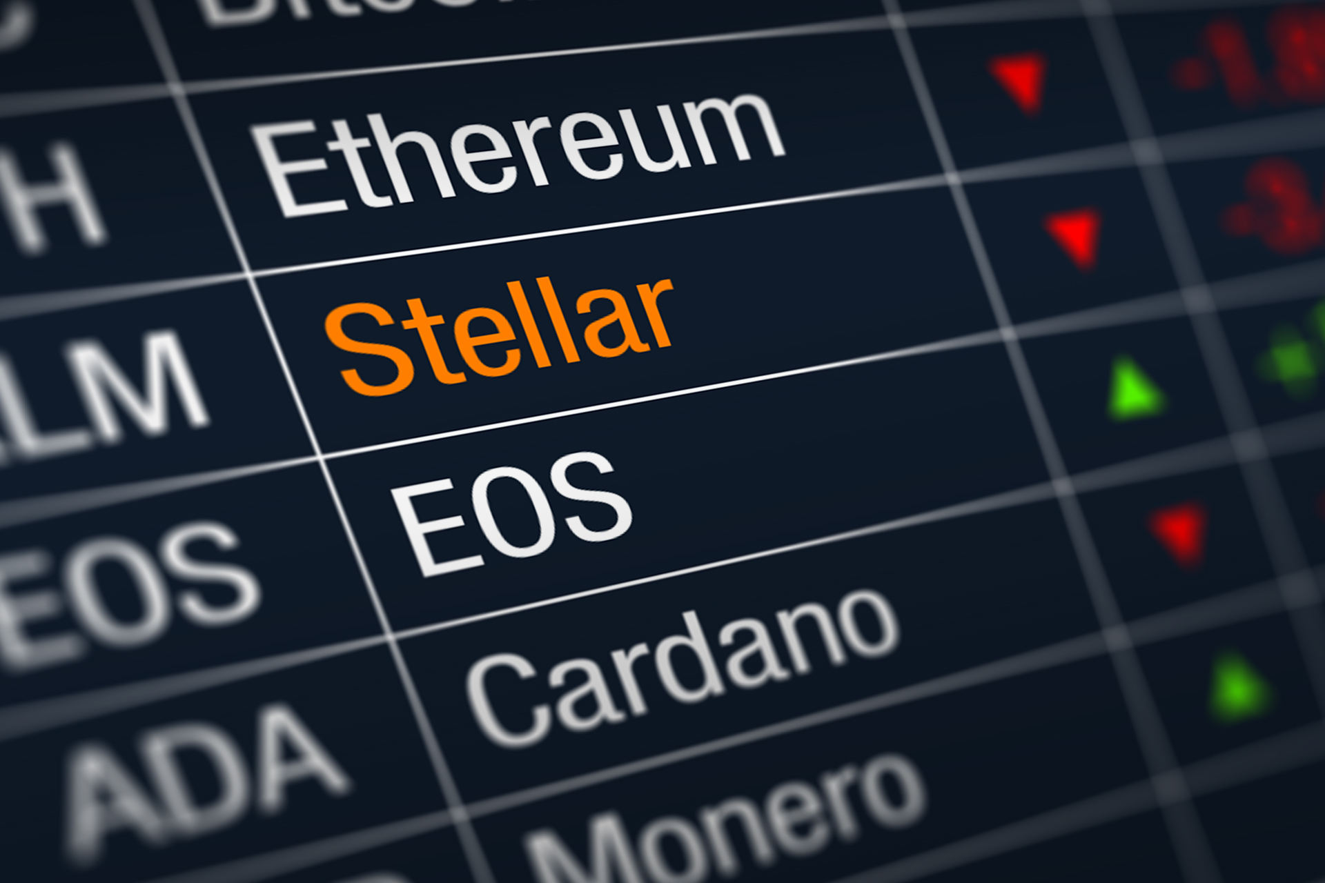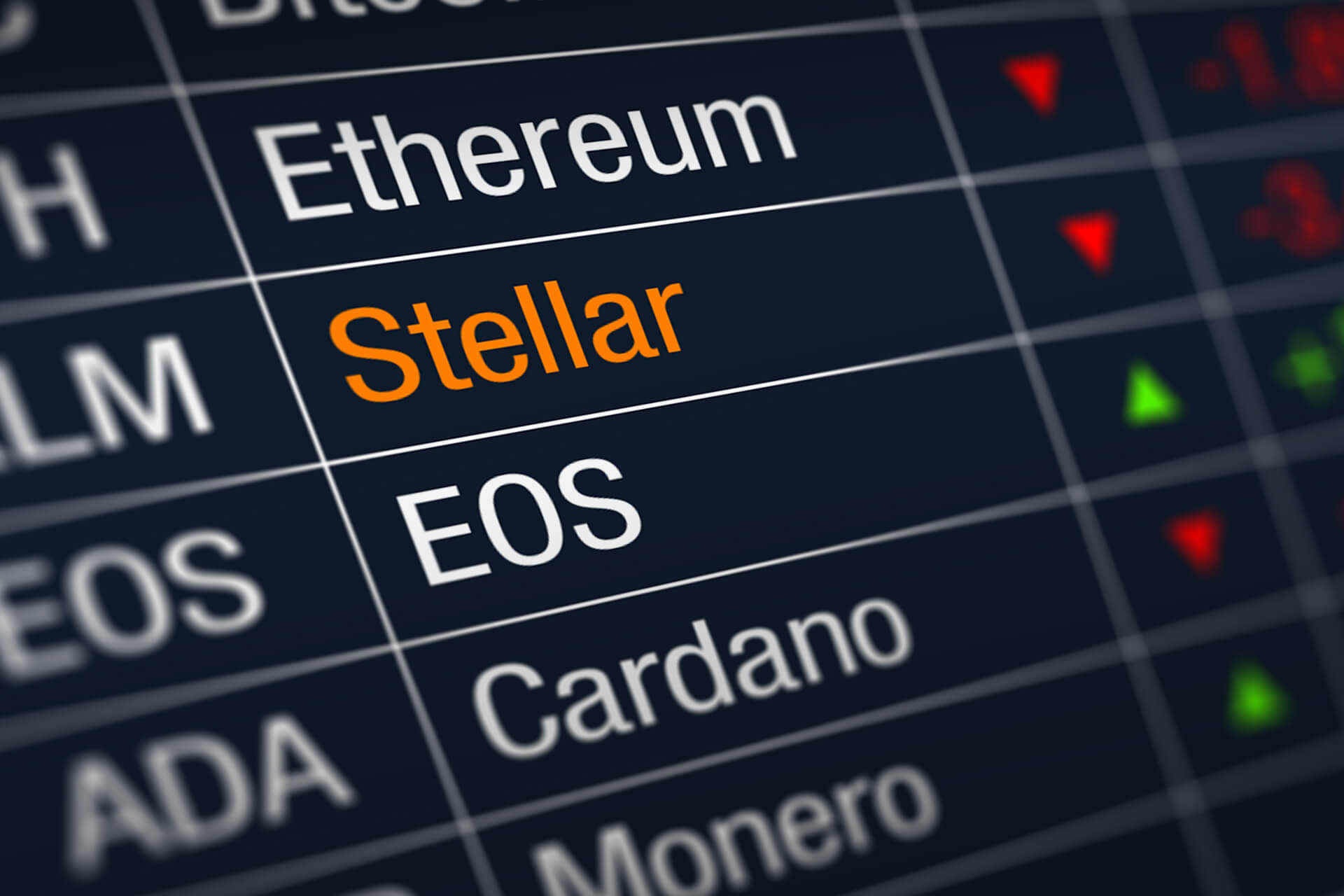 Stock ticker chart showing cryptocurrency prices with Stellar price decline highlighted