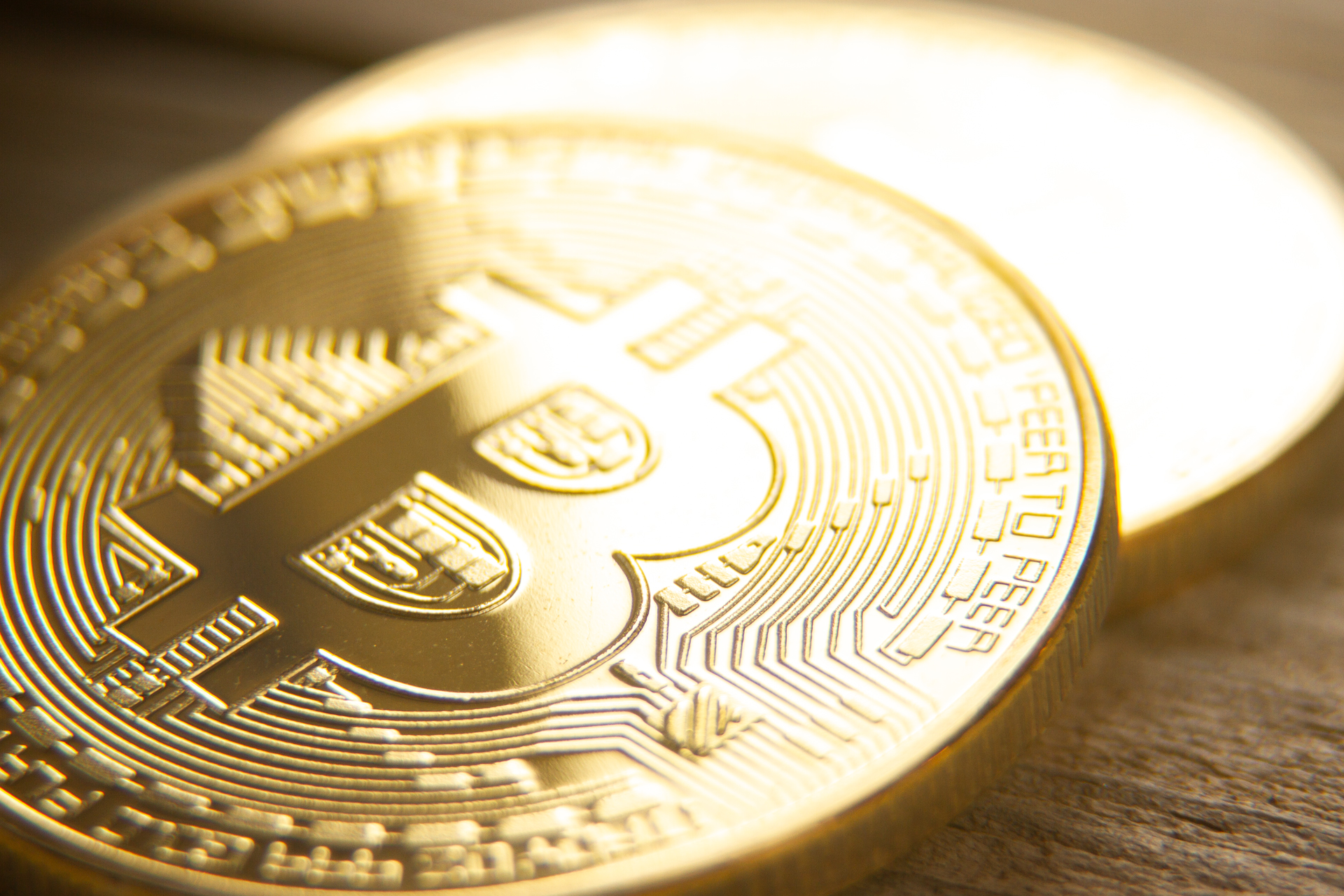 Two bitcoins laid on wood background with shallow depth of field and highlight