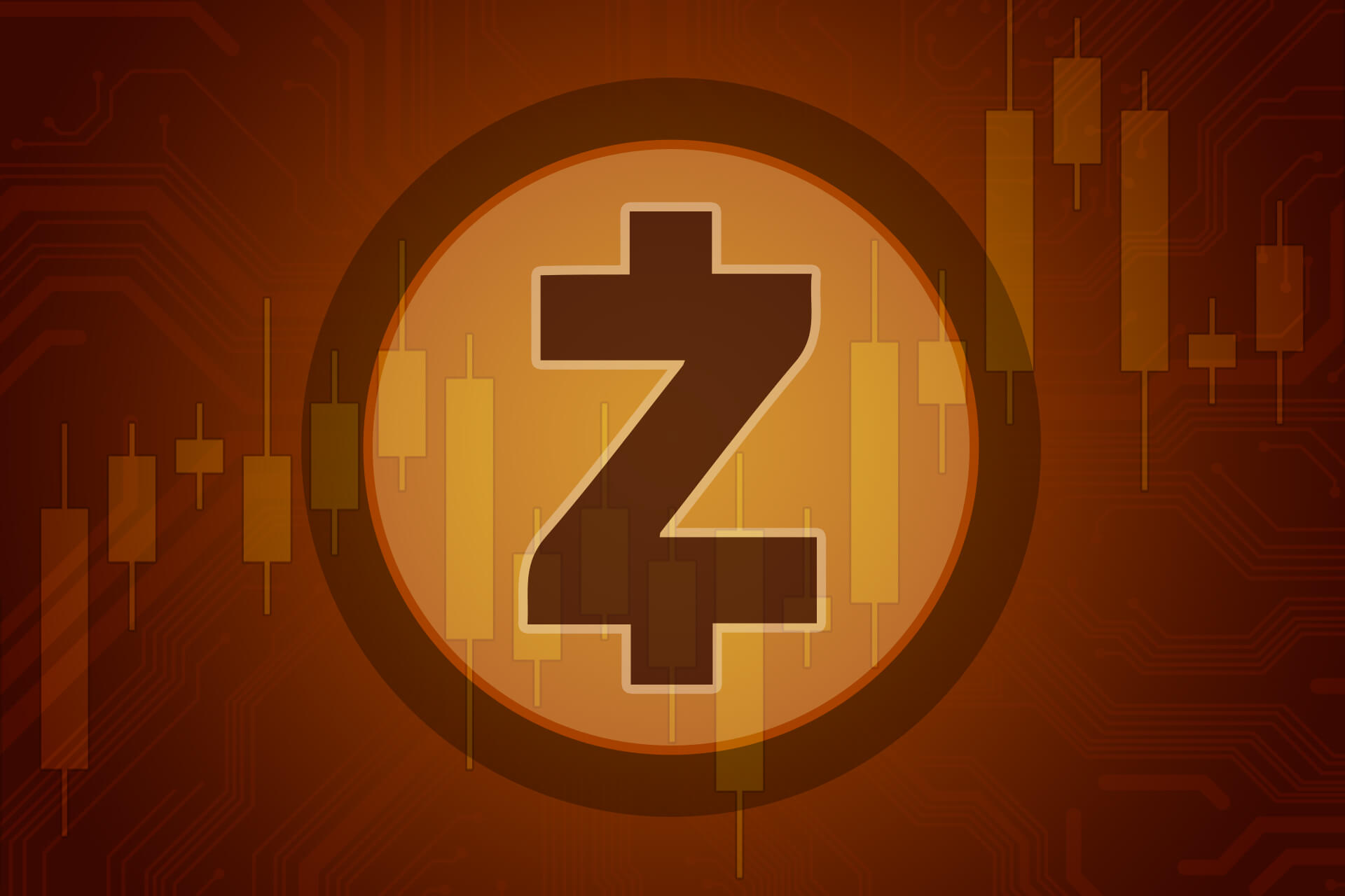 Zcash cryptocurrency token overlaid on stock price candlestick chart and subtle circuit background
