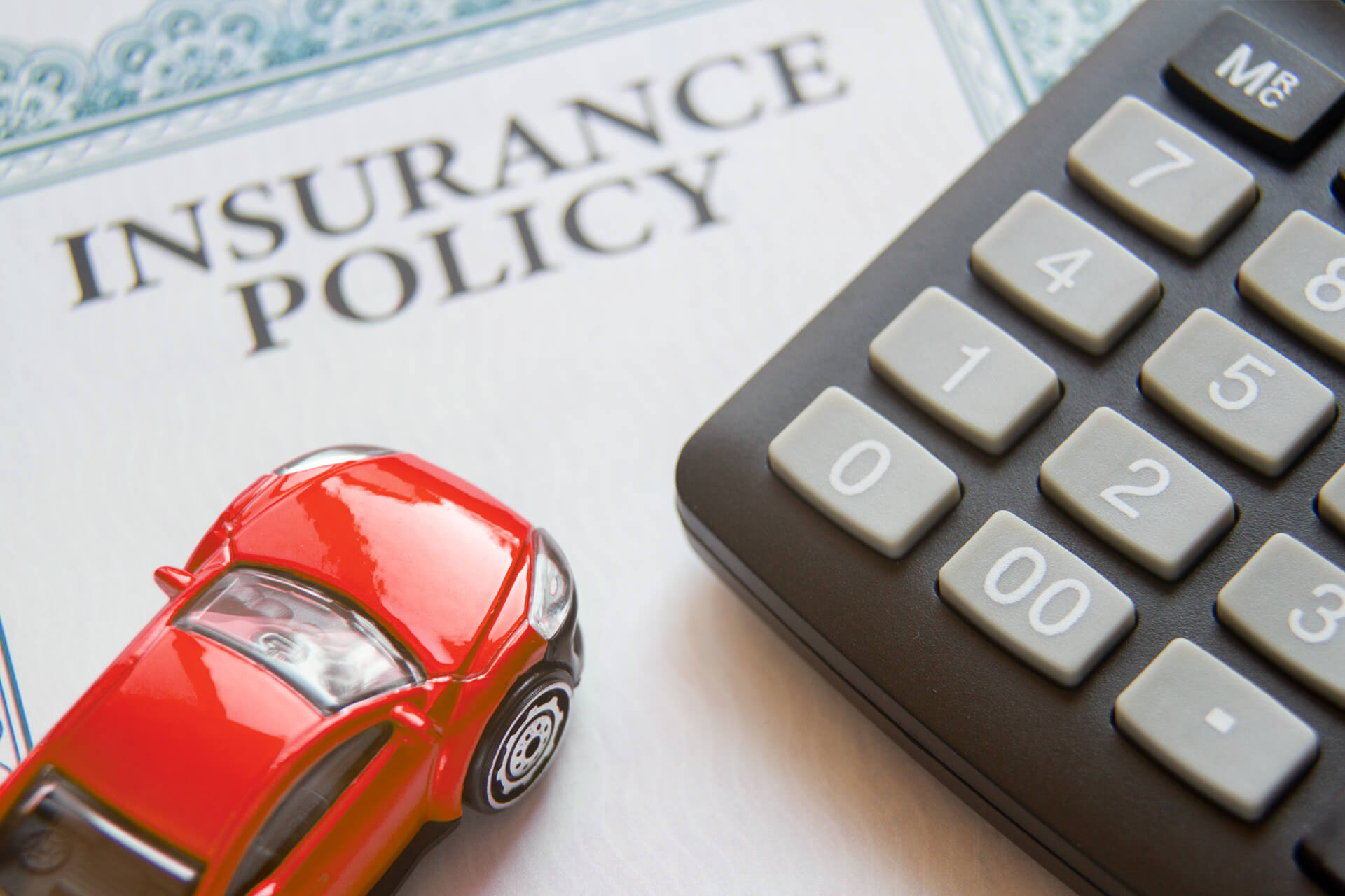 Desk with car insurance policy, toy car, coffee cup and calculator with hand holding pen and touching key on calculator