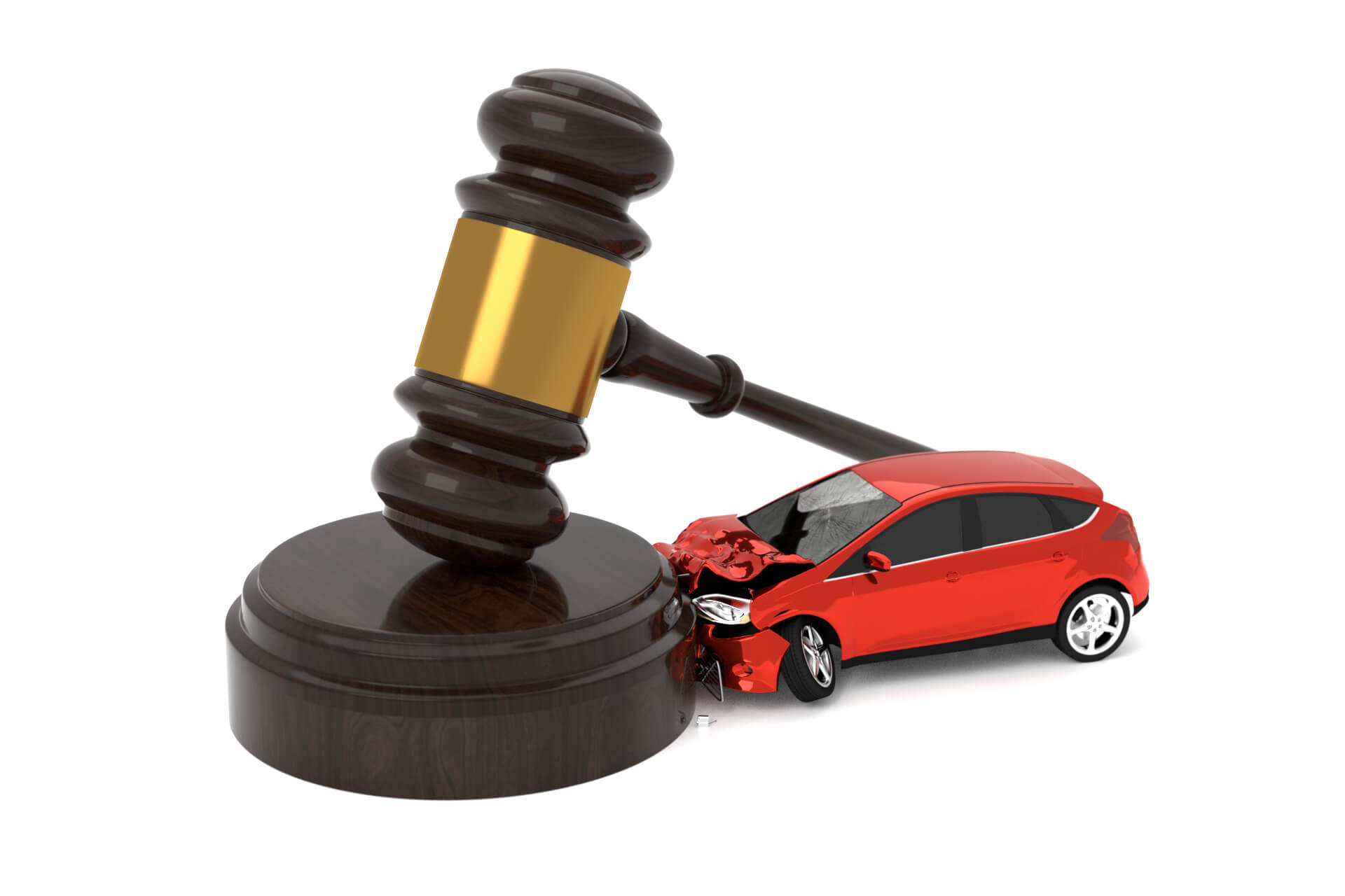 Car crashed into judge gavel concept for car insurance liability isolated on white background