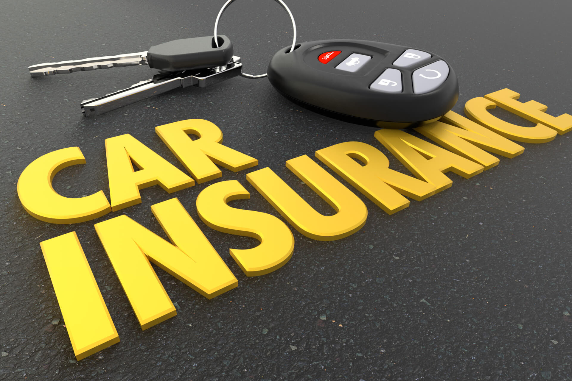 Auto insurance concept image showing car keys and key fob resting on shiny car insurance text