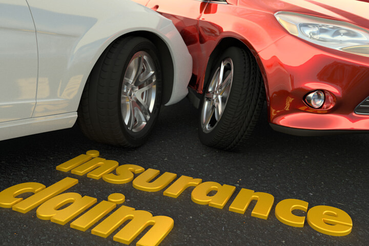 Insurance claim form with two cars colliding and large red DENIED stamp indicating car insurance company denial of a claim