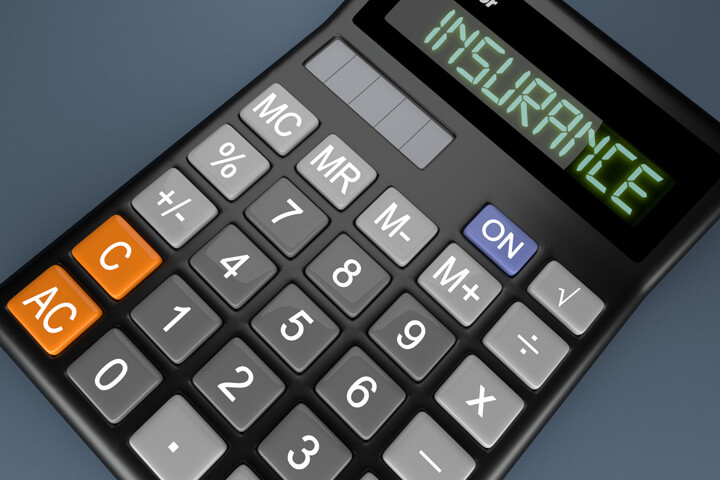 Desk with car insurance policy, toy car, coffee cup, money, and calculator with hand holding pen and touching key on calculator