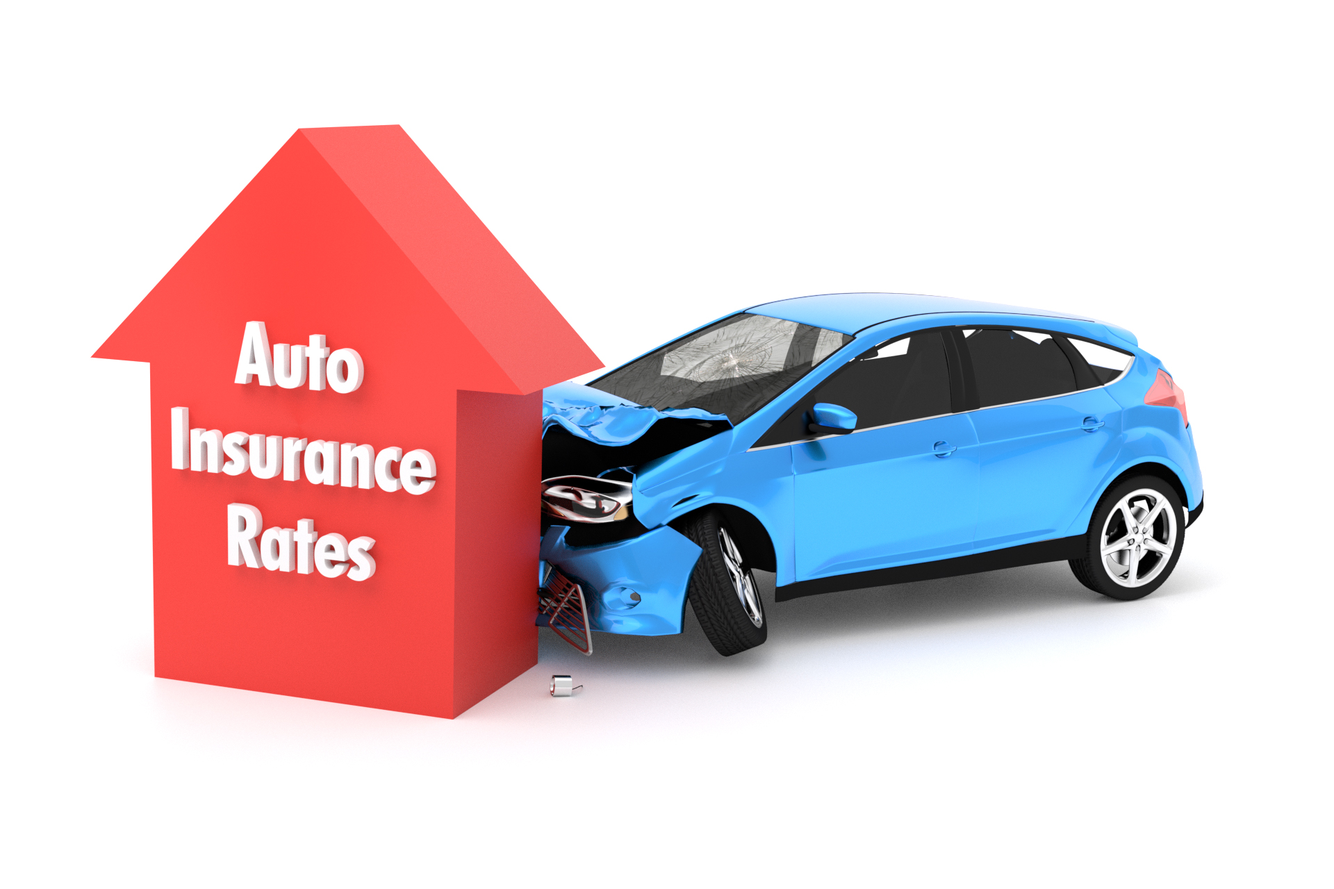 Auto insurance concept of car crashing into up arrow representing higher car insurance rates