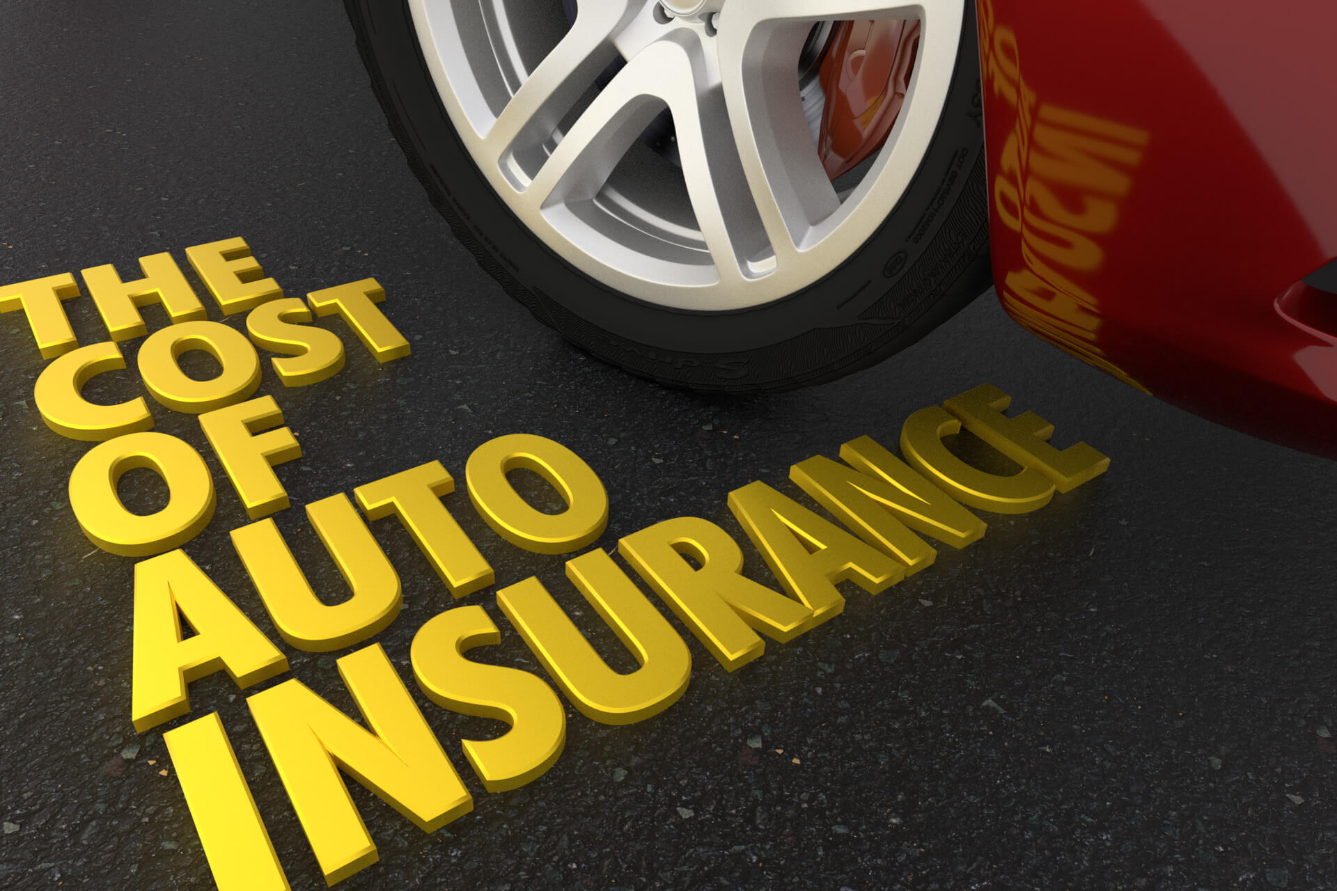 Shiny gold text The Cost of Auto Insurance on road next to sports car
