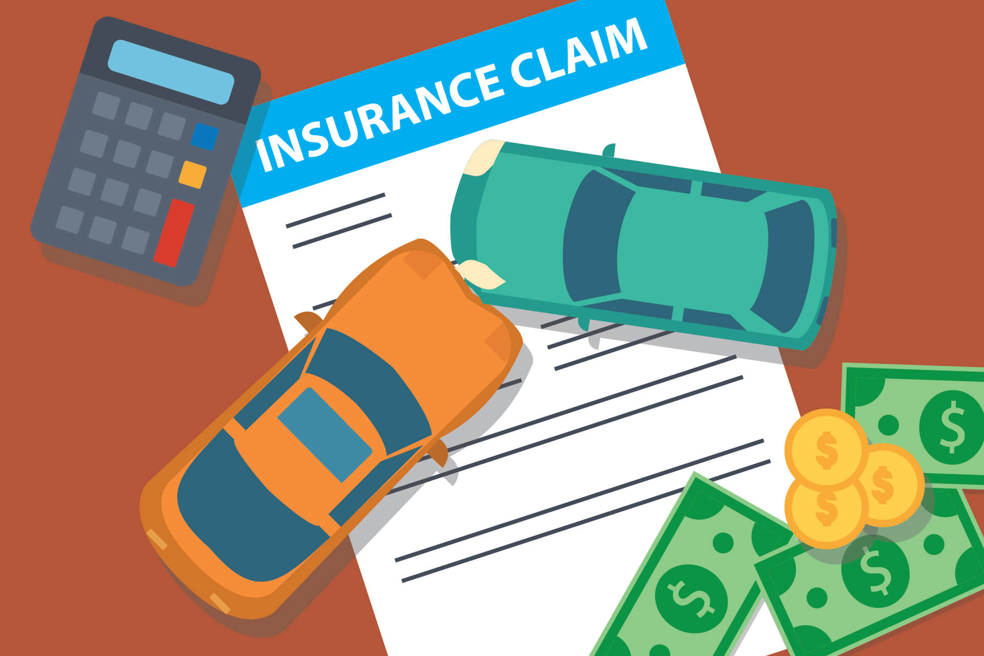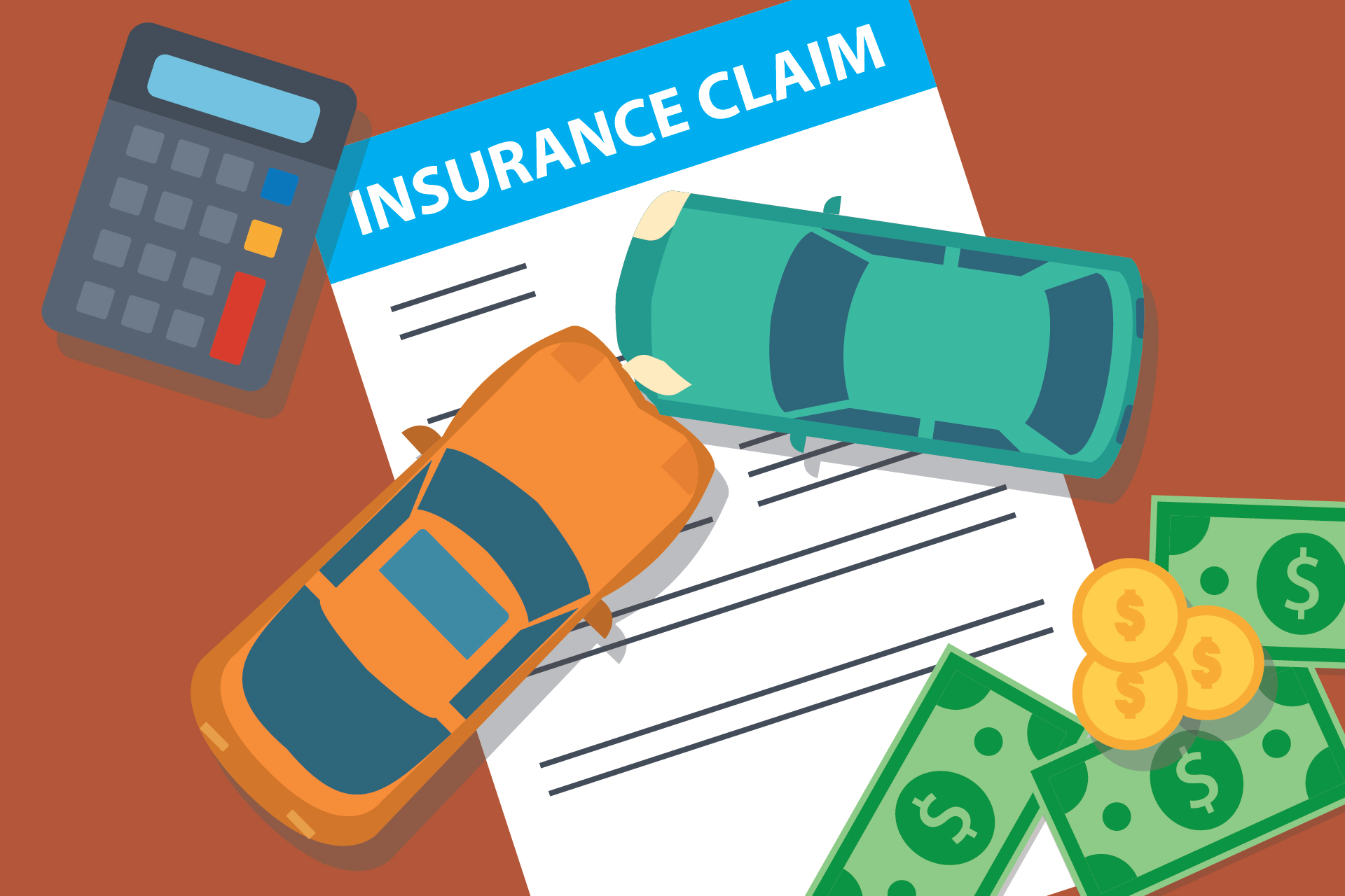 Insurance claim form with two car collision concept with calculator and cash and coins concept for payment of a car insurance claim on dark orange background