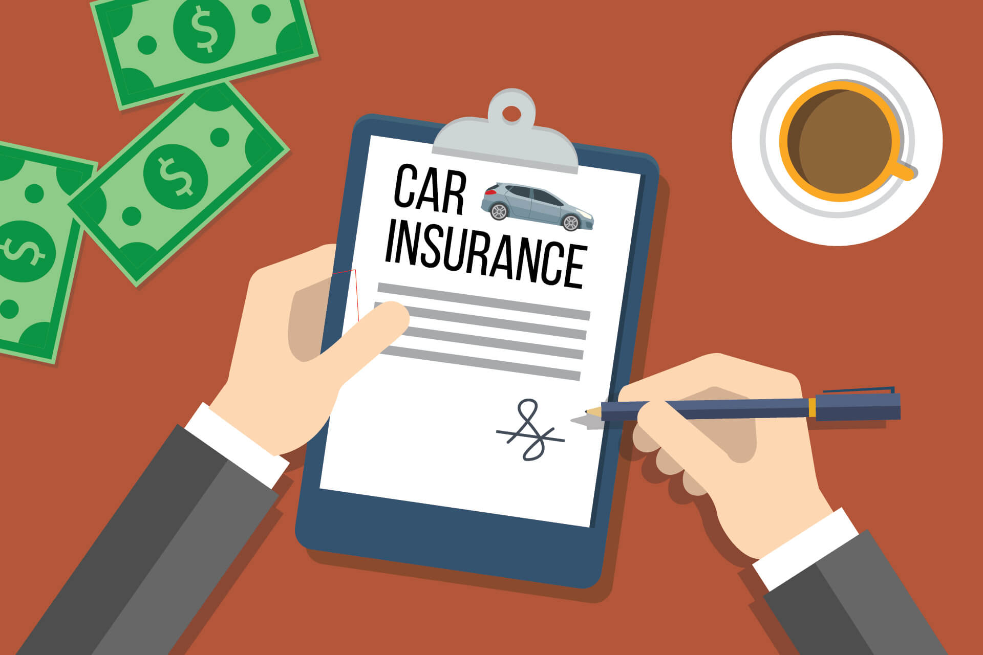 Hands on desktop signing car insurance policy with coffee cup and cash on opposite sides