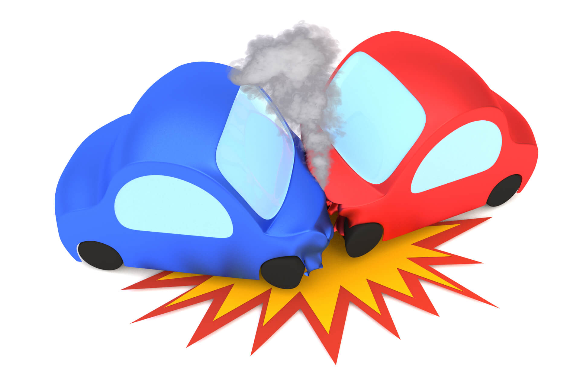 3D cartoon render of two vehicle collision isolated on white with collision burst and smoke