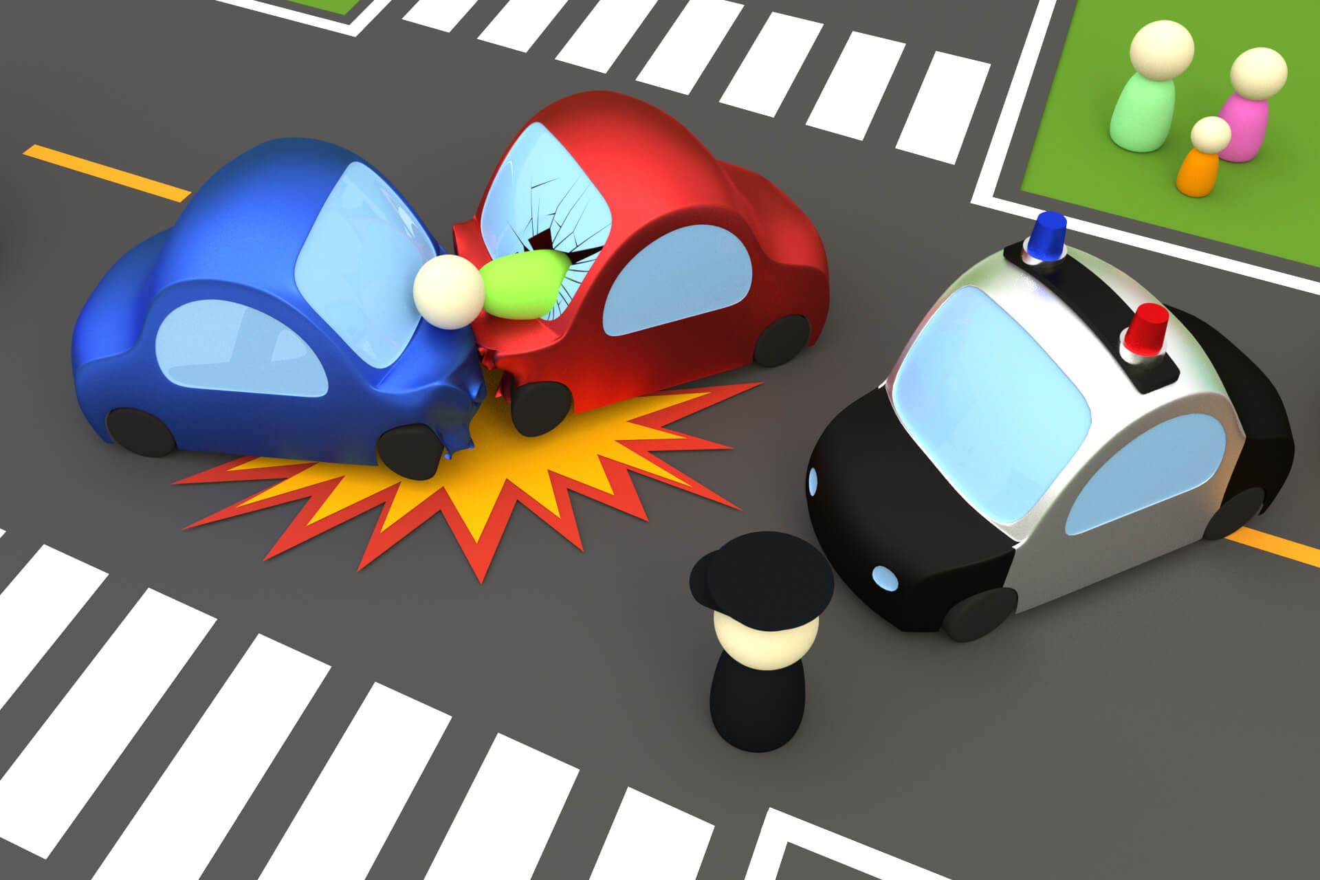Side impact accident with burst indicating impact on top of car insurance policy with blue background