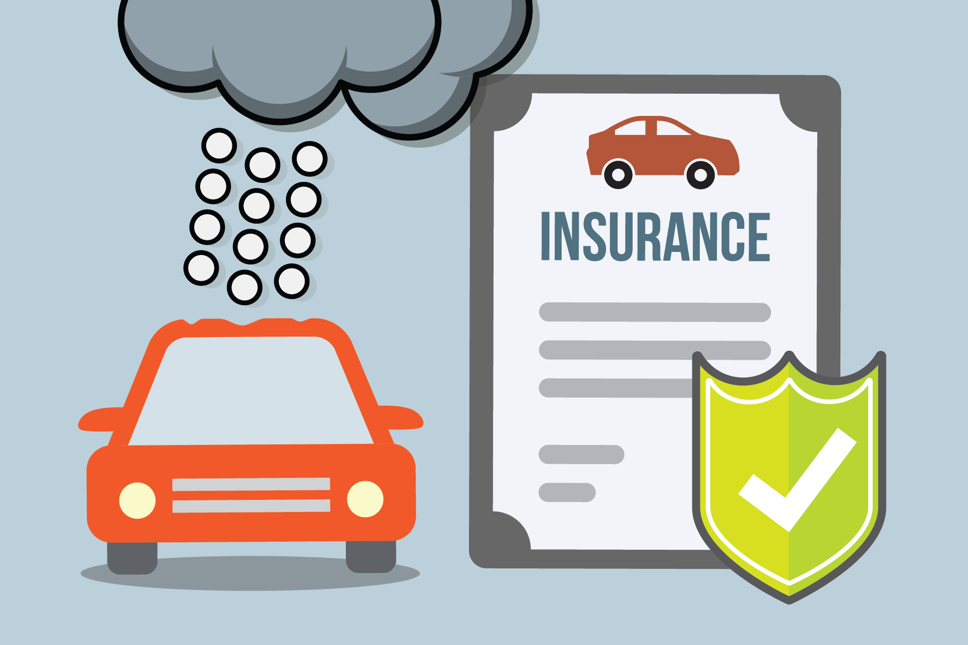 Car insurance policy and shield beside dented car under hail storm flat concept for hail insurance