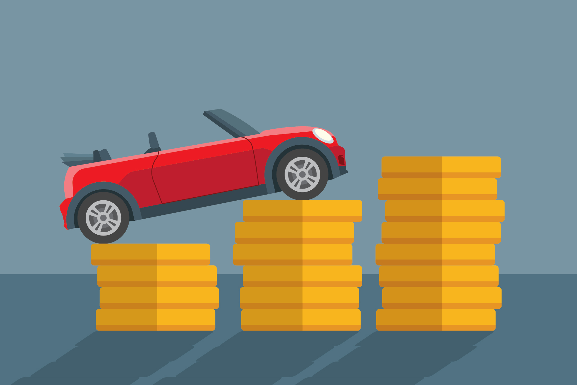 Toy car on coin stacks flat design concept for auto insurance price increase or increasingly expensive car insurance