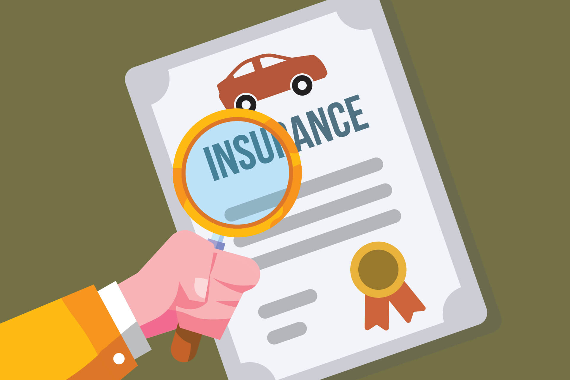 Car insurance policy with magnifying glass flat concept for reading insurance policy language and coverages