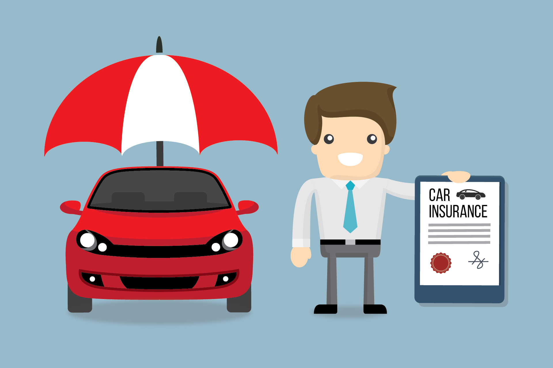 insurance agent blue car car insurance smiling coverage policy light red umbrella auto insurance protection