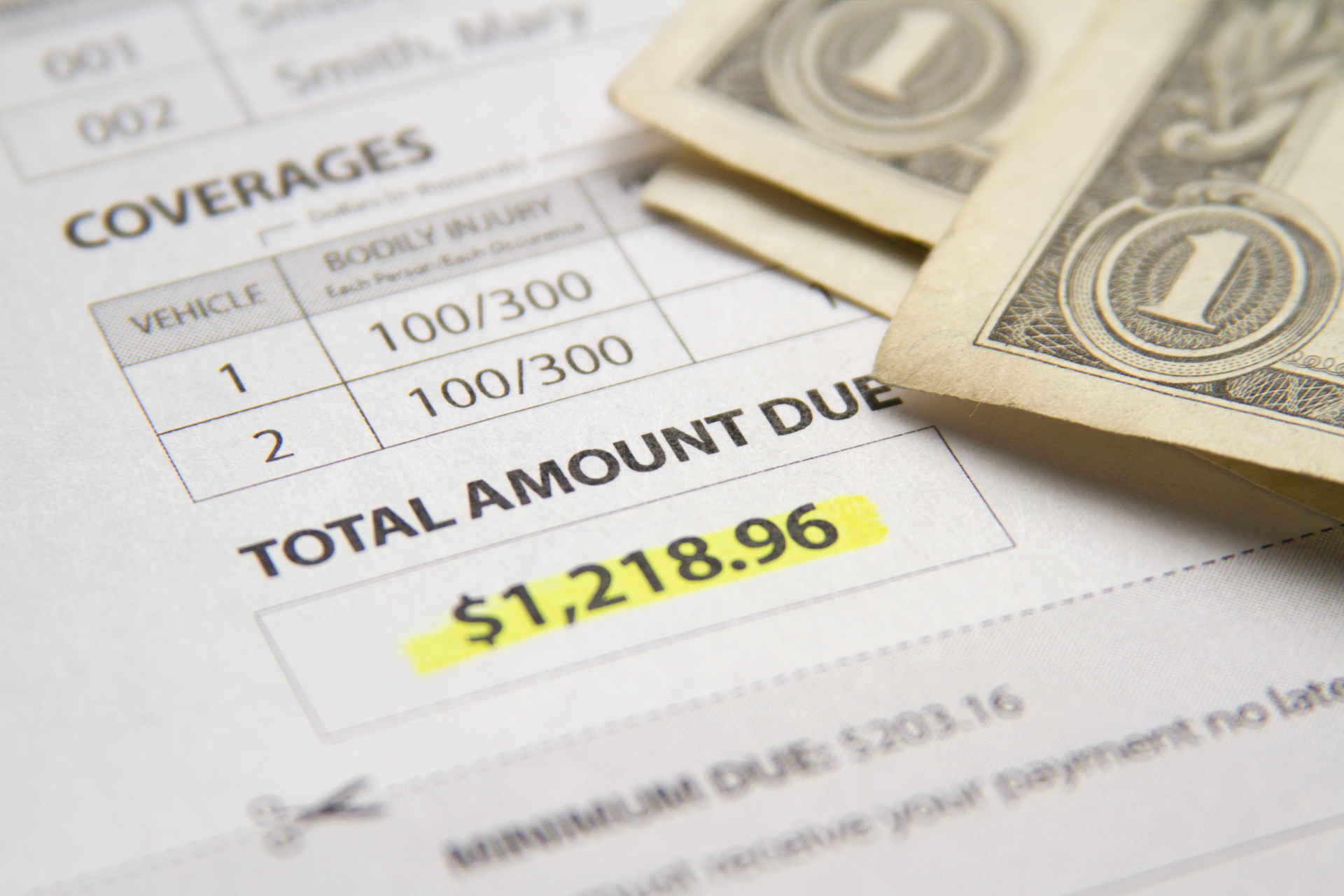 Car insurance policy showing total amount due with dollar bills