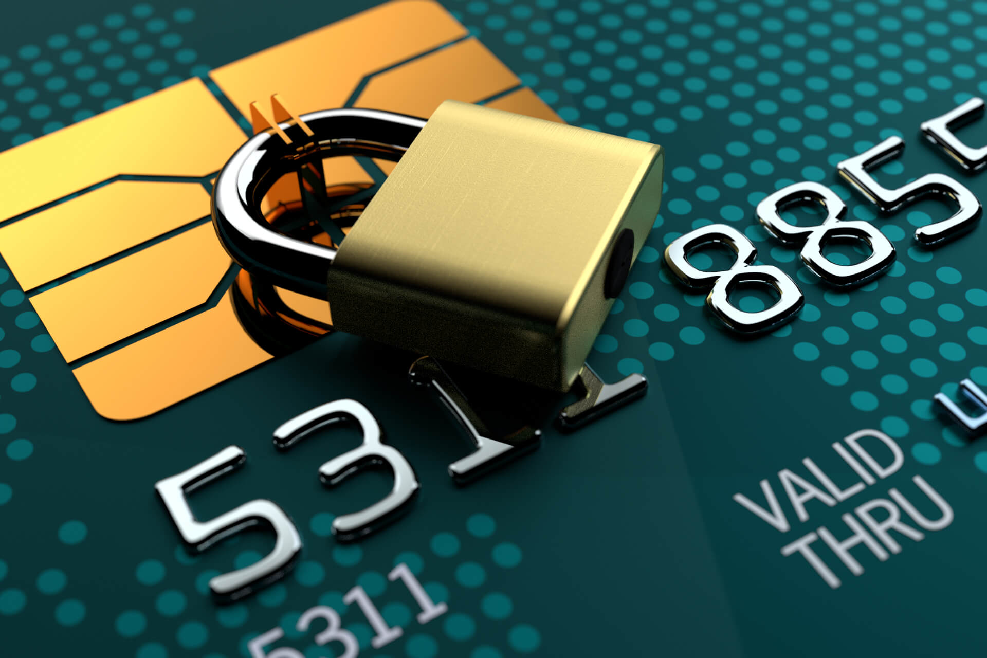 Close up photo of credit card EMV chip with padlock concept for credit lock or credit freeze