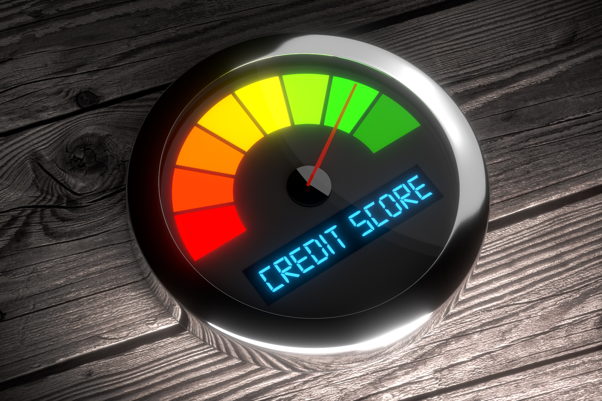 Chrome credit score gauge on weathered wood planks showing good credit rating