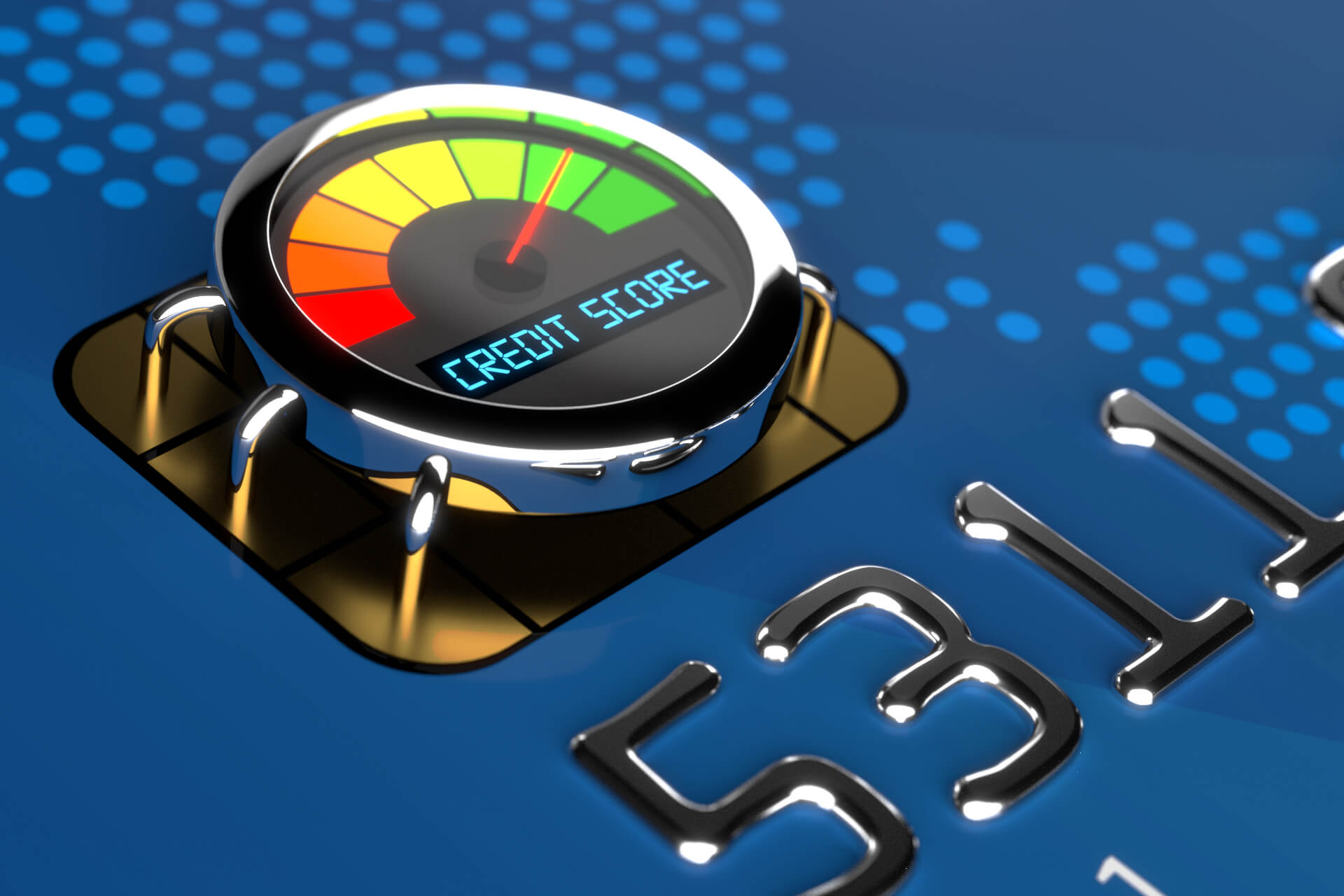 Close up of credit card EMV chip with chrome speedometer style gauge showing good credit score