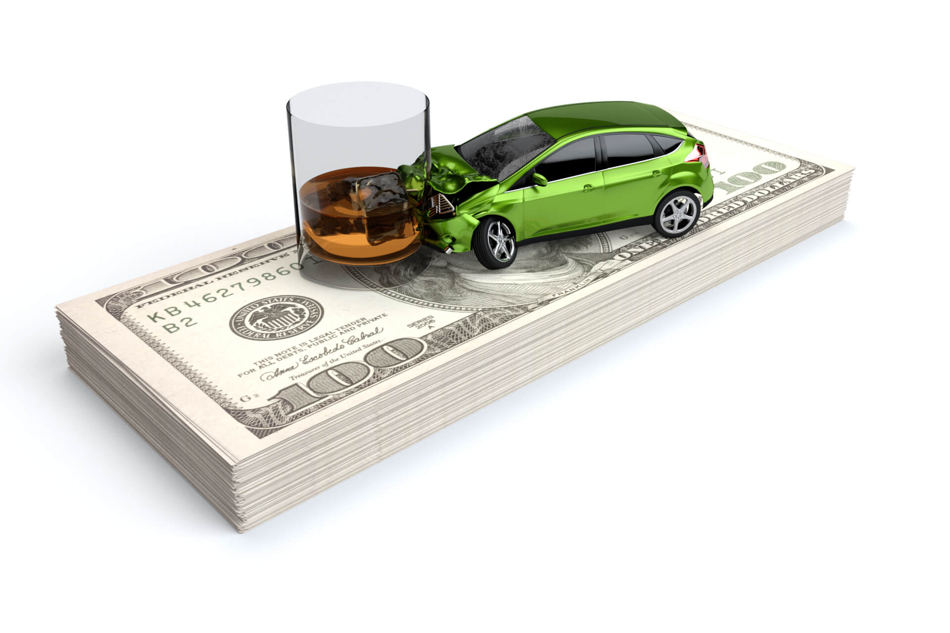 Car crashed into whiskey glass DUI accident on stack of cash illustrating the high cost of DUI