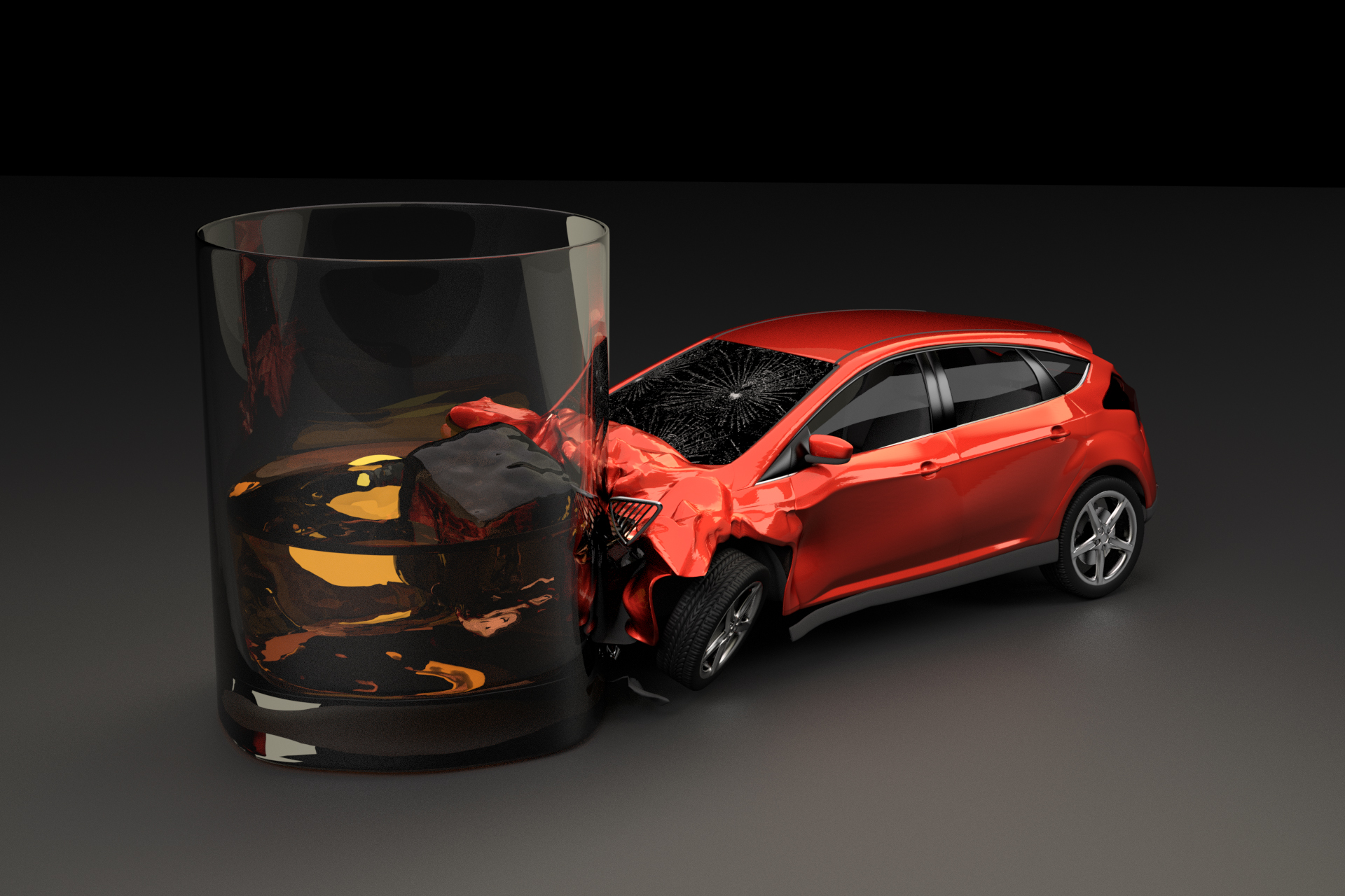 Red compact car crashed into alcoholic drink on dark studio background concept for driving while impaired