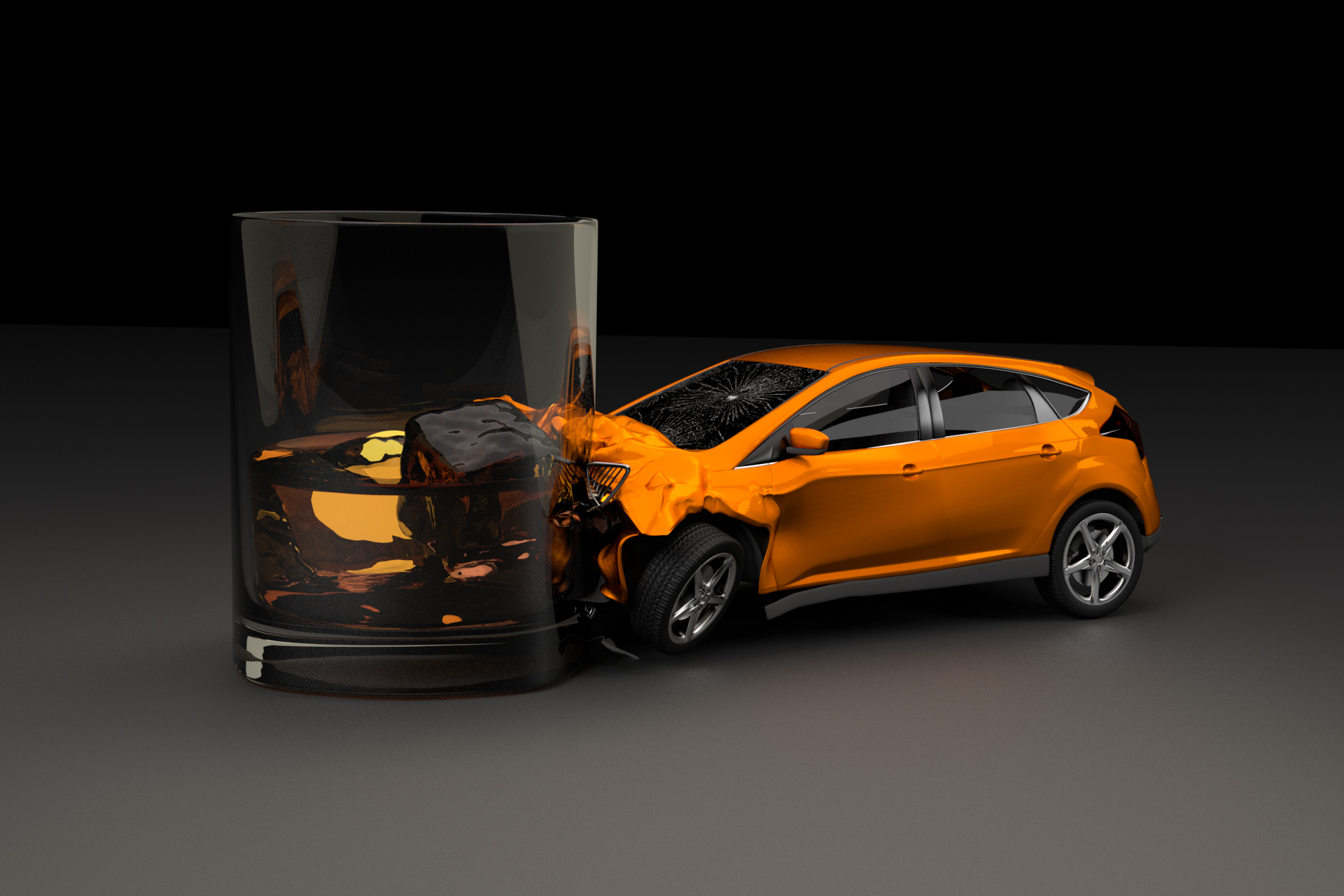 Red car crashed into beer bottle laying on side concept for drunk driving or DUI with dark background