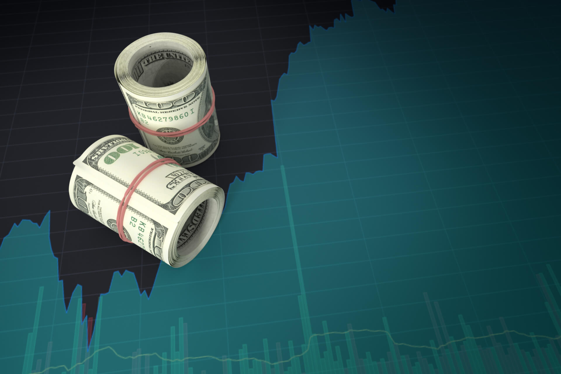 Rolls of U.S. currency on computer screen with stock price area chart